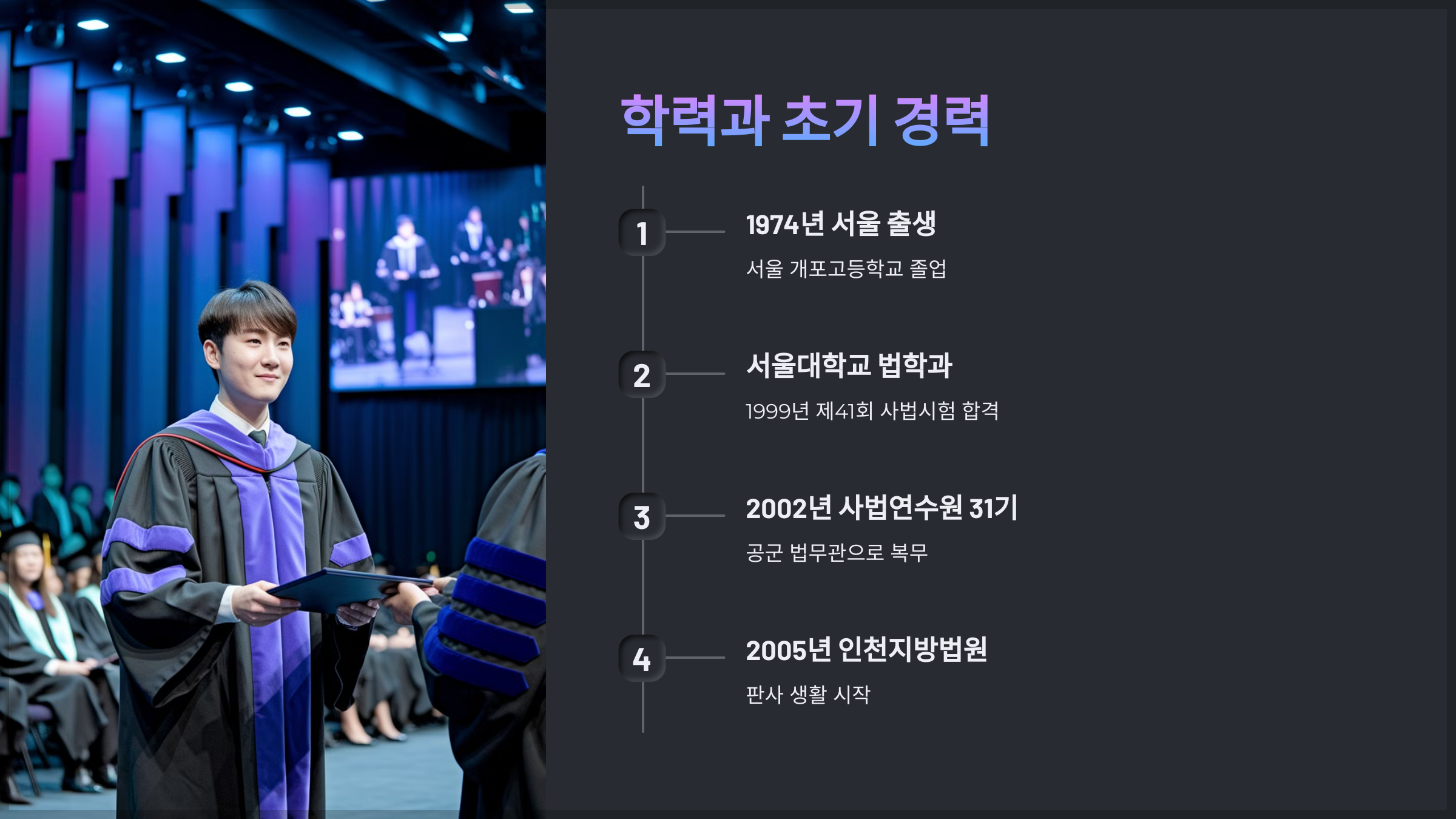 사법연수원 수료 후 공군 법무관으로 복무하며 법조인의 기초를 다졌습니다. 이후 2005년 인천지방법원에서 판사 생활을 시작하면서 본격적인 법조인의 길에 들어섰습니다.