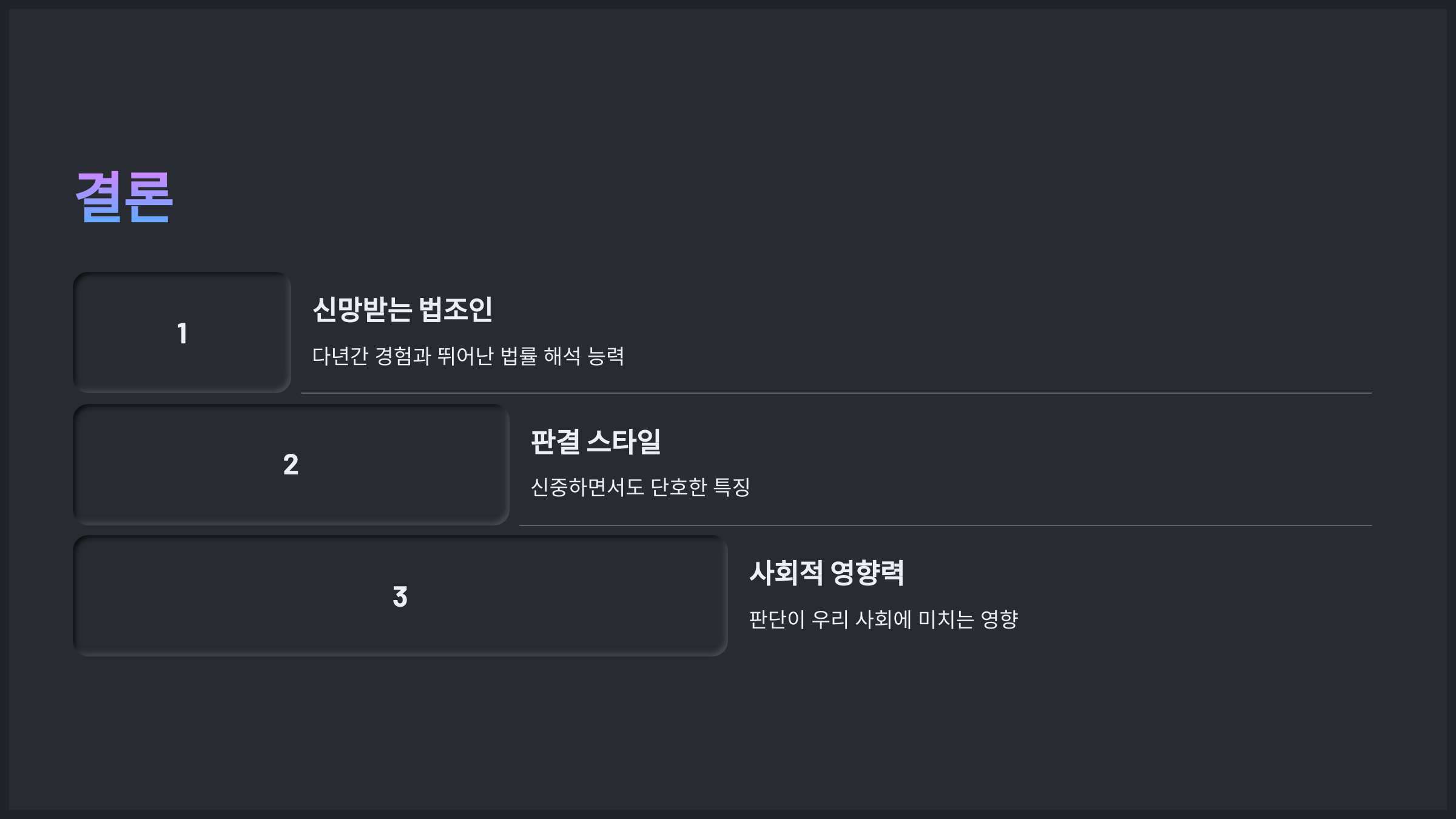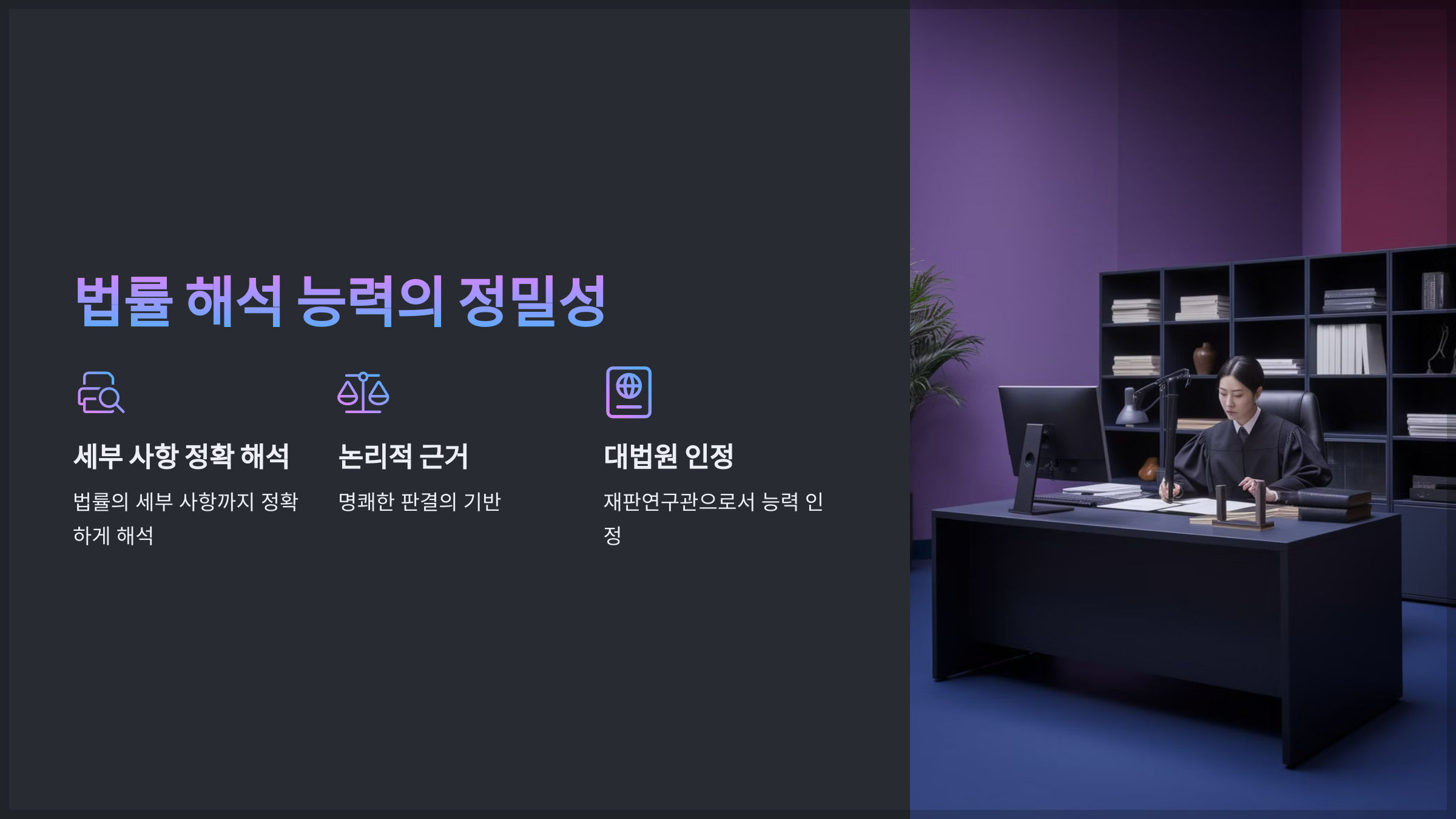 - 복잡한 법률적 문제에서도 논리적인 근거를 바탕으로 명쾌한 판결을 내리는 능력이 뛰어납니다.