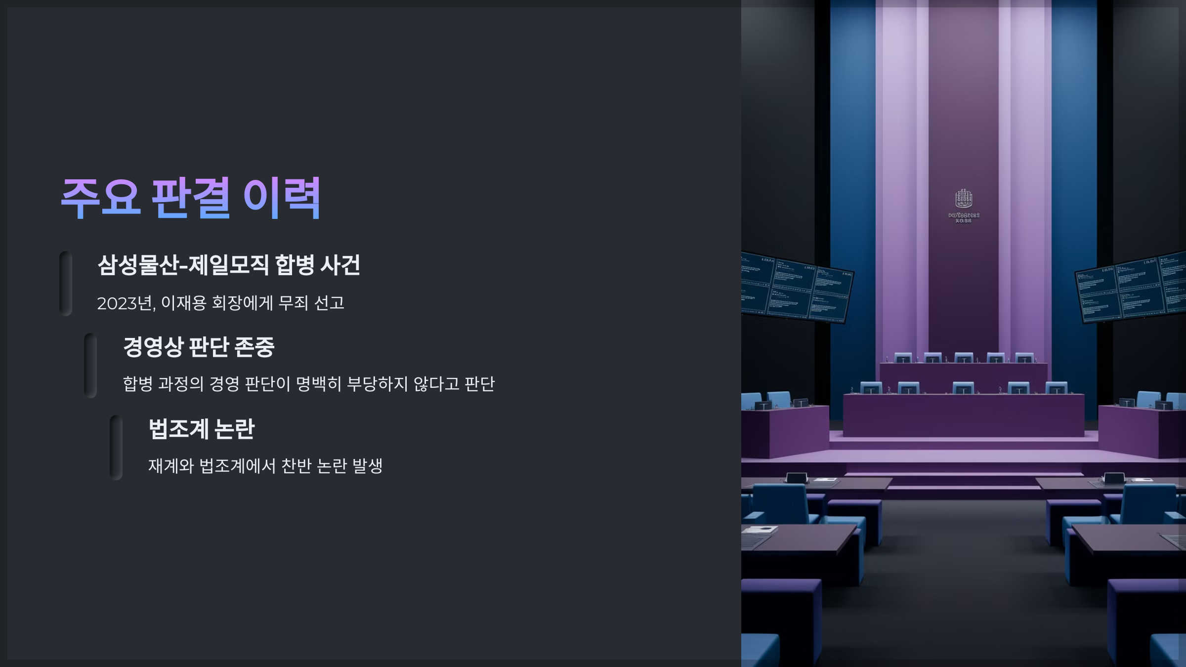 - 2023년, 삼성물산과 제일모직의 합병 과정에서 발생한 부당 합병 의혹 사건에서 이재용 삼성전자 회장에게 무죄를 선고했습니다.