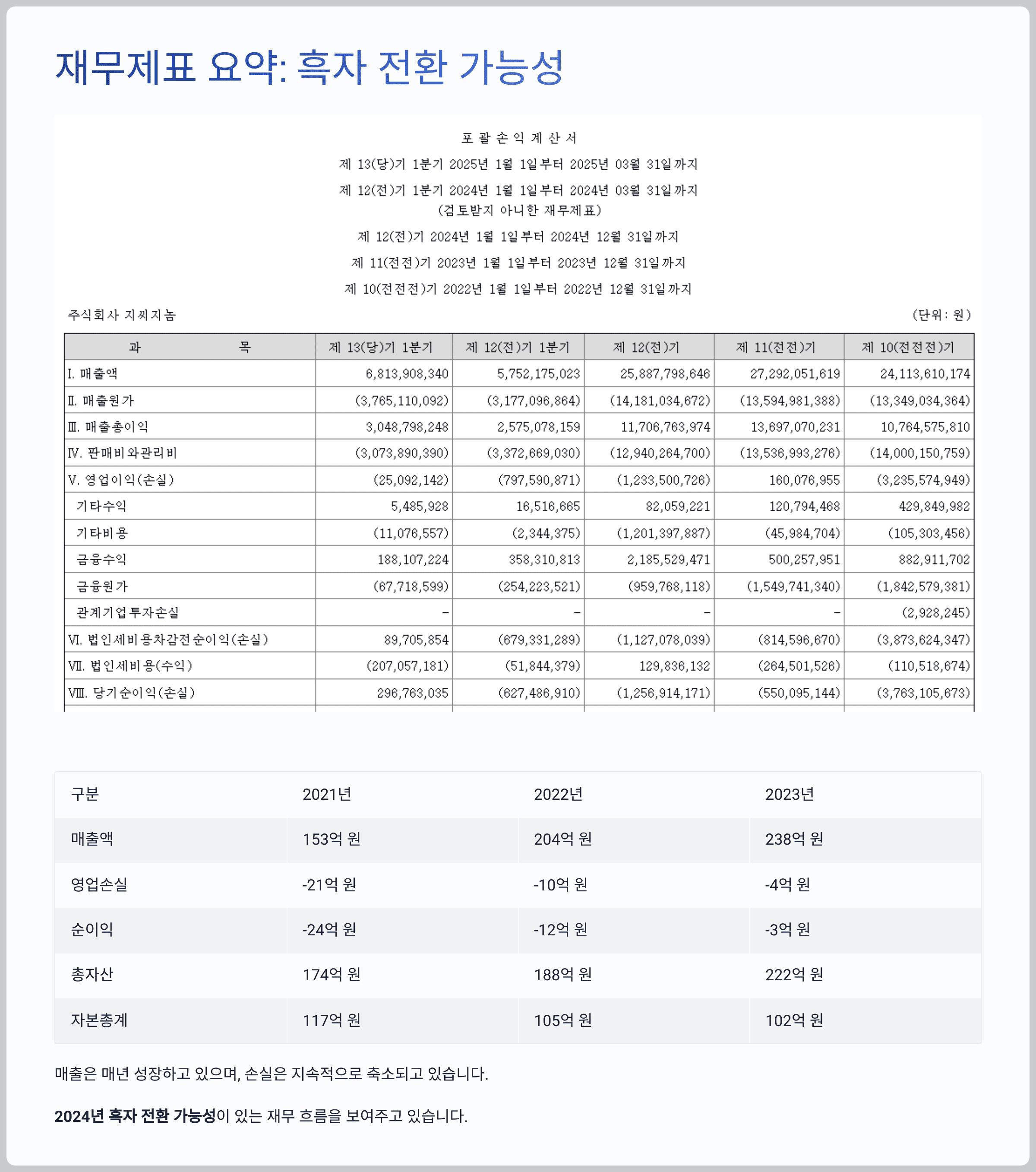 💰 투자 설명서 핵심 재무제표 요약: 흑자 전환 가능성은?