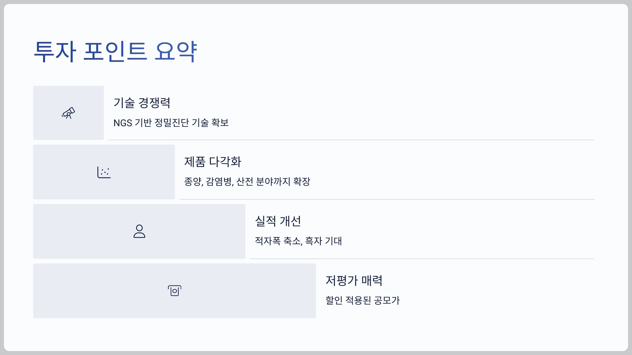 - 기술 경쟁력: NGS 기반 정밀진단 기술 확보