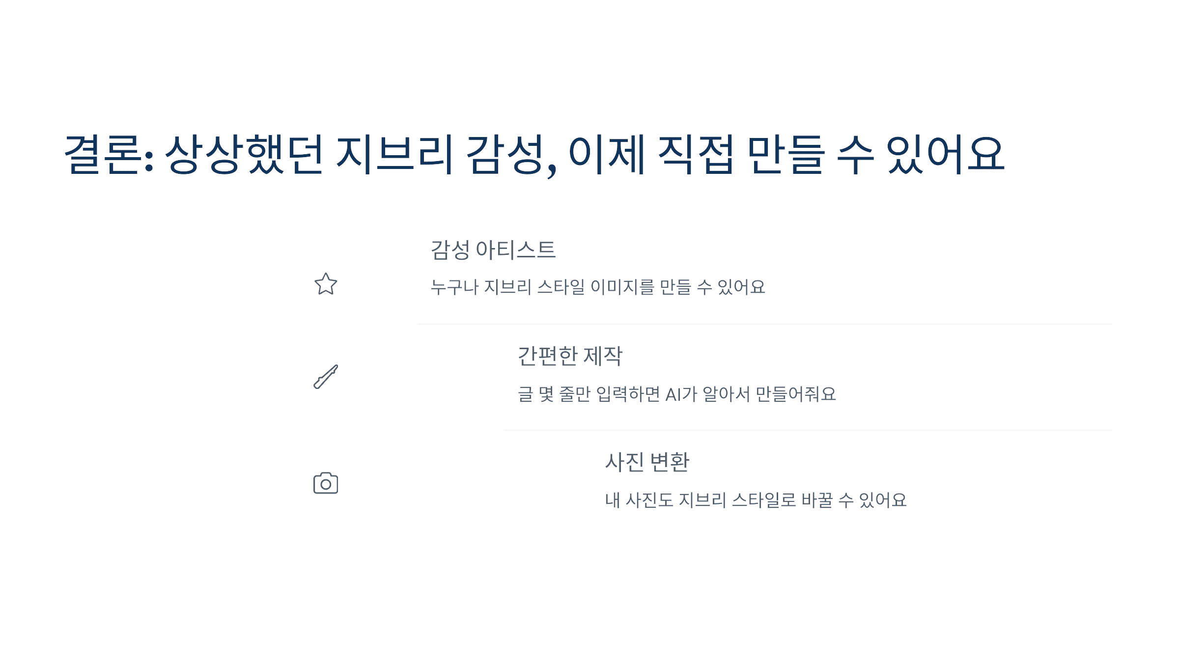 글 몇 줄만 입력하면 AI가 알아서 만들어주고, 내 사진도 지브리 스타일로 바꿔주는 편리함까지!