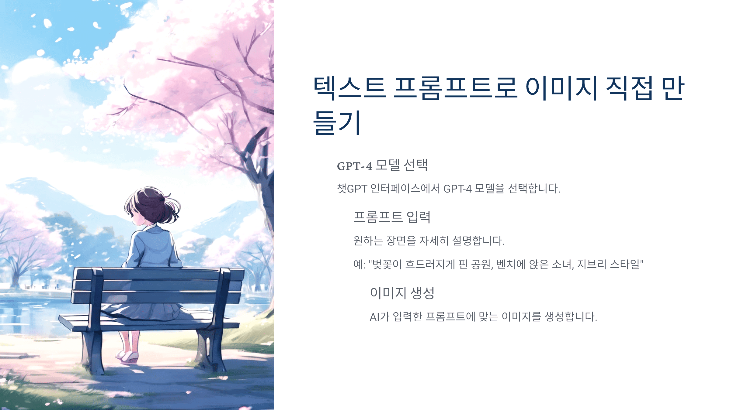 예시:"벚꽃이 흐드러지게 핀 공원, 벤치에 앉은 소녀, 지브리 스타일""지브리풍 해안 마을, 노을지는 하늘, 고요한 분위기"