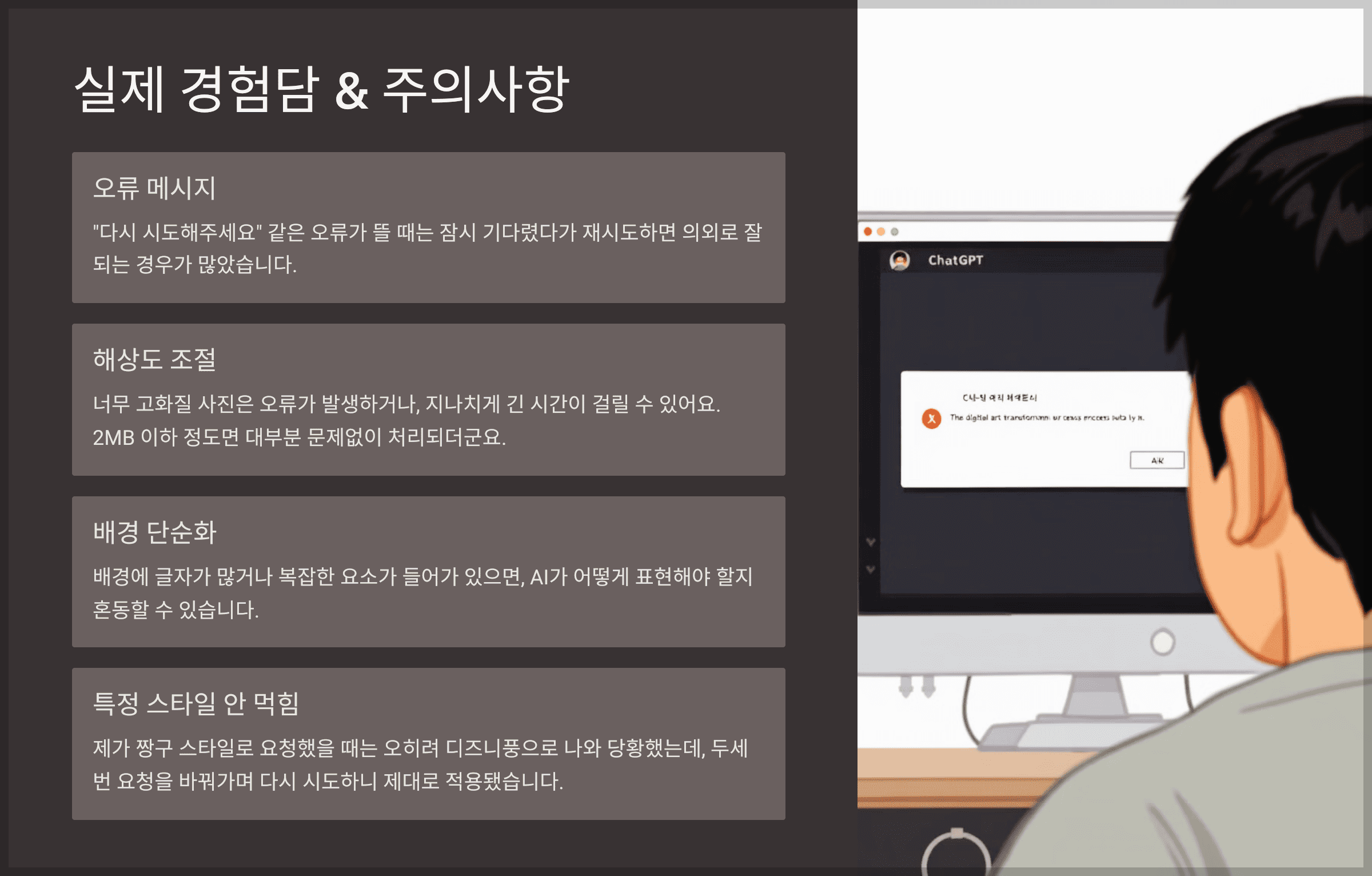 조금 번거로울 수도 있지만, 이 과정을 즐기는 게 챗GPT 이미지 변환의 매력이 아닐까 싶어요. 실패작이 나오더라도 의외로 재미있고 웃긴 결과물이 될 때가 많거든요.