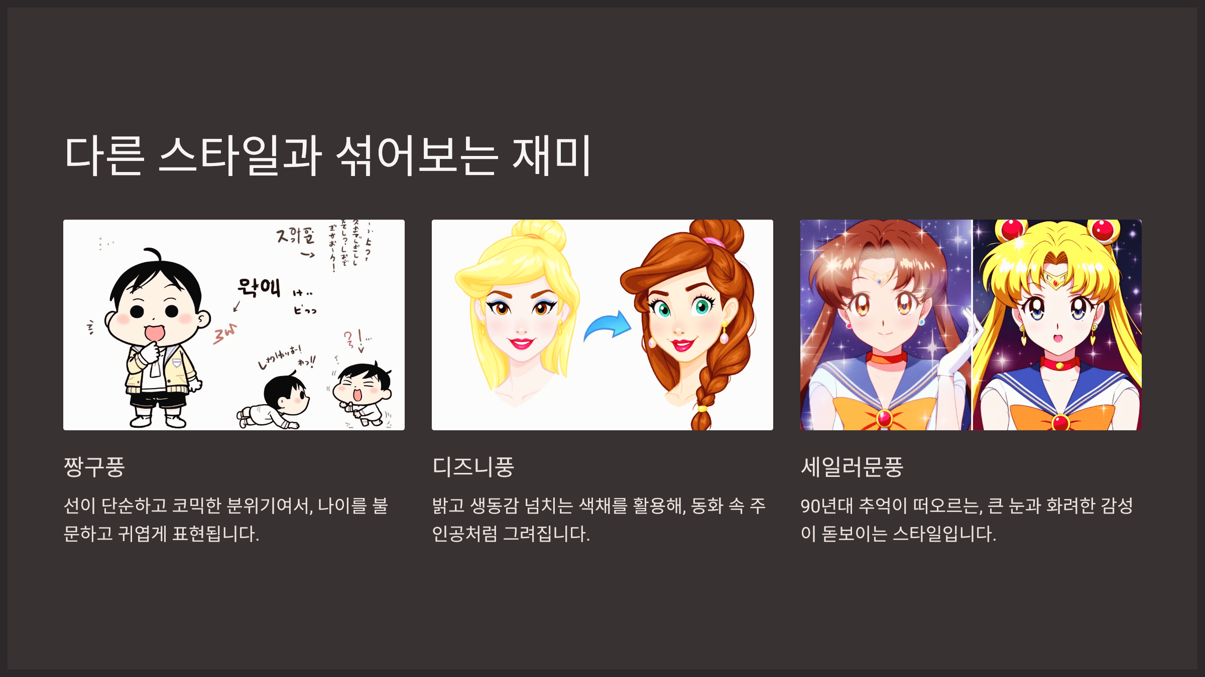 - 디즈니풍: 밝고 생동감 넘치는 색채를 활용해, 동화 속 주인공처럼 그려집니다.