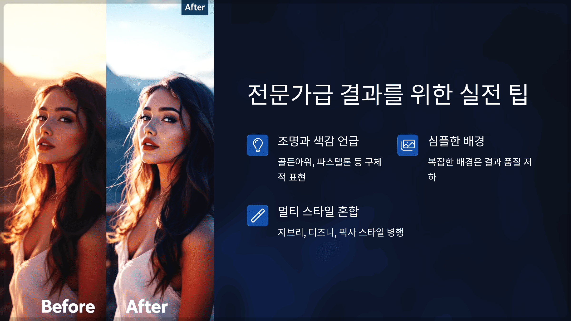 - 조명과 색감을 직접 언급하세요. 예: "골든아워 느낌", "안개의 꿈속의 느낌" 등 원하는 조명과 색감을 지적할 수 있어요.