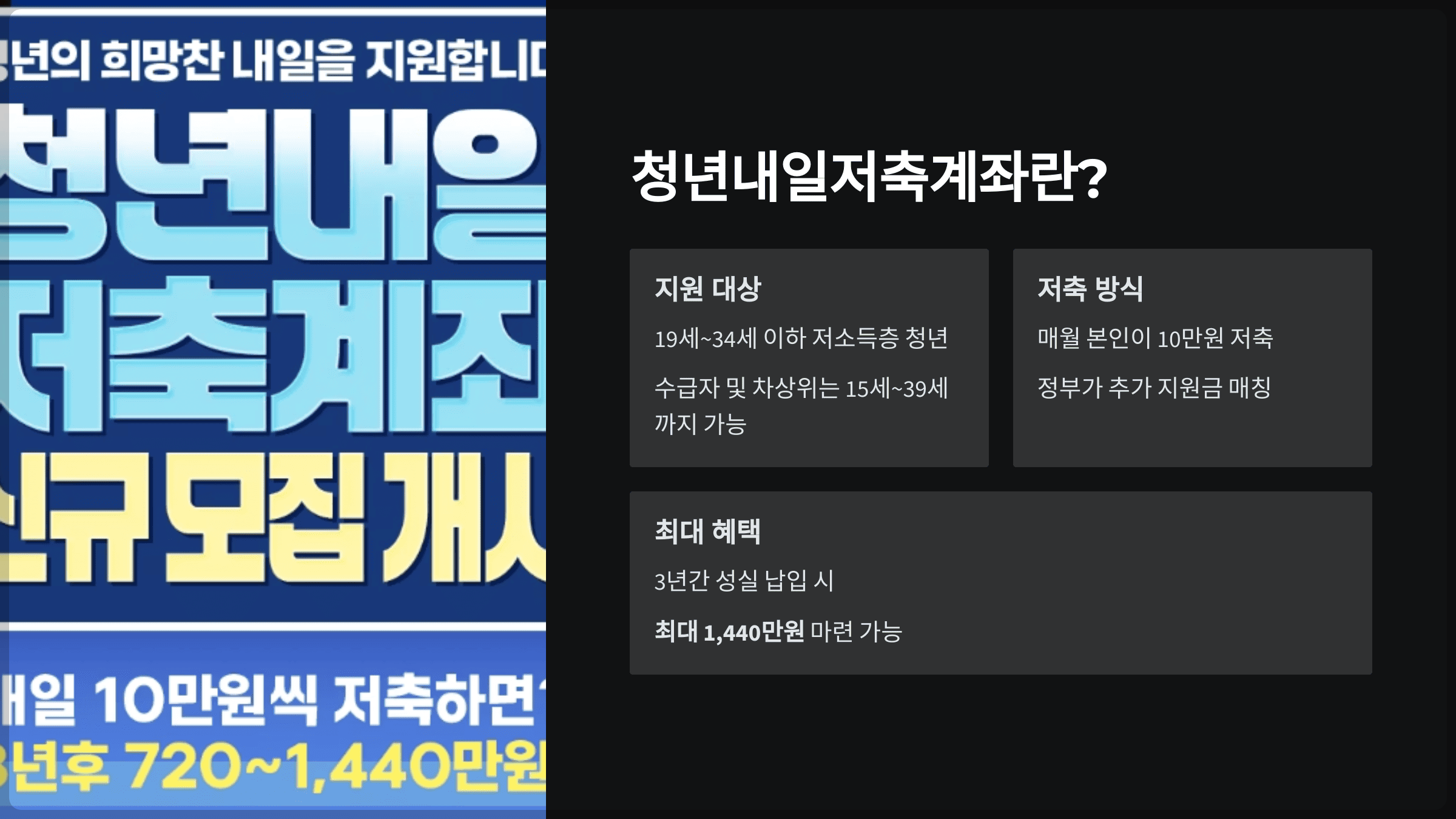 매일 10만 원씩 저축하면, 3년간 성실히 납입하면 최대 1,440만 원(본인 저축 720만 원 + 정부 지원 720만 원)을 마련할 수 있는 기회입니다. 단 수급자 및 차상위 이하는 만 15세 ~ 39세까지 가능해요.