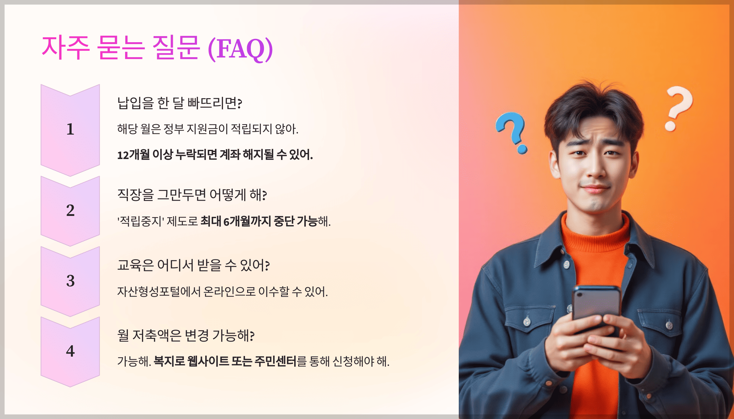 근로 중단이 불가피한 상황이라면, 최대 6개월까지 적립 중지 신청 가능해. 그동안 정부 지원도 중단되지만, 계좌는 유지돼.