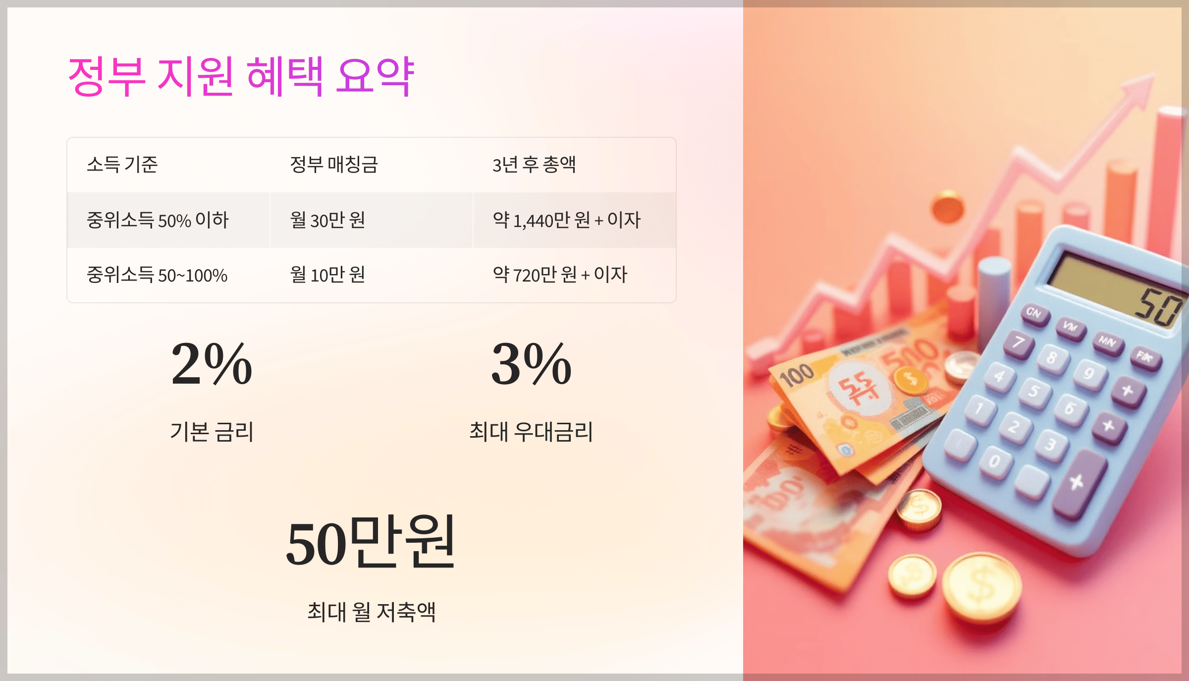 3년이라는 시간이 길게 느껴질 수도 있지만, 매월 10만 원의 꾸준한 저축이 수백만 원의 지원금으로 돌아오는 구조라면 충분히 해볼 만하지.