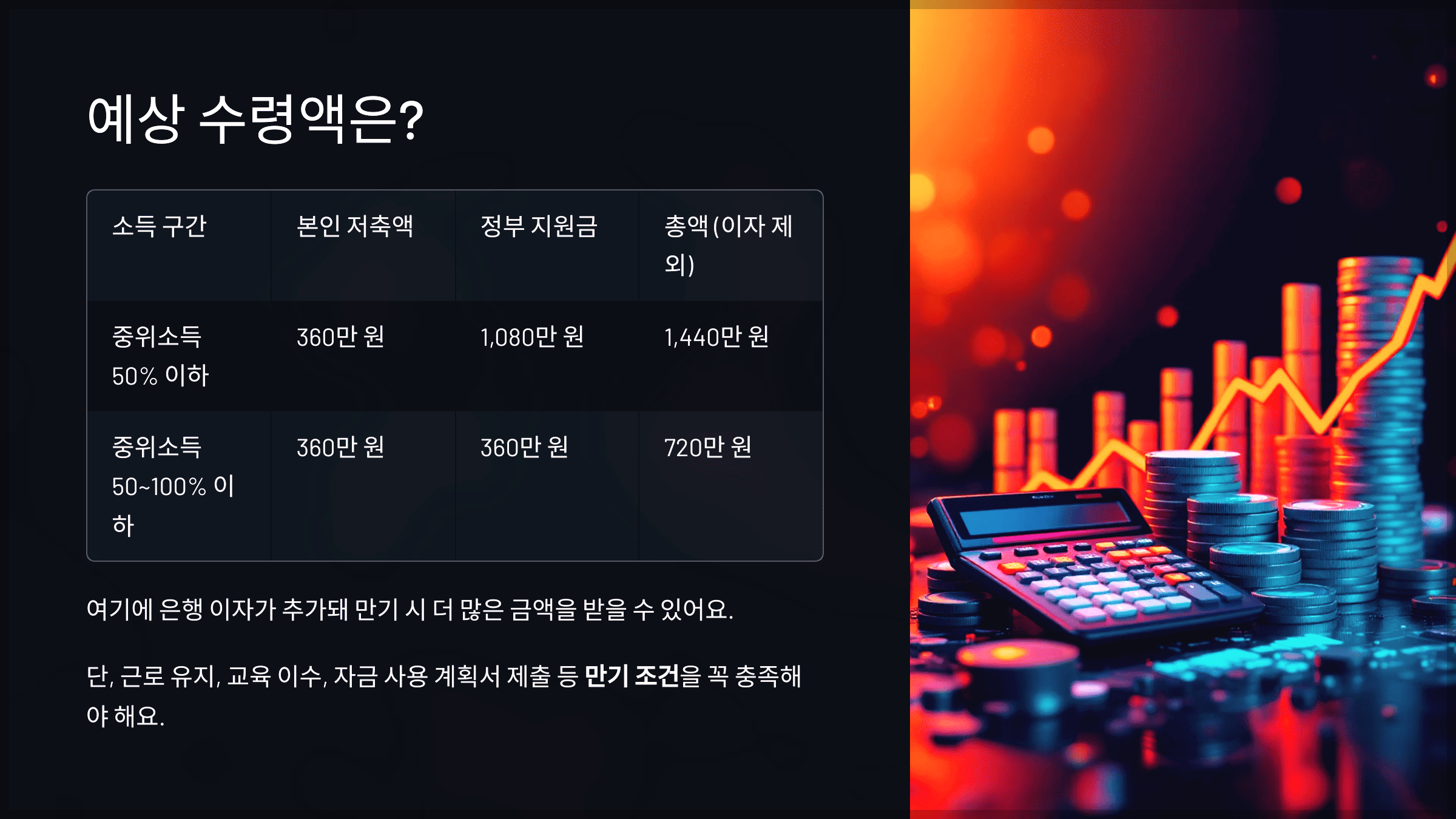 - 중도 해지 시 손해: 해지하면 정부 지원금은 받지 못하고, 본인 저축액과 이자만 받을 수 있어요.