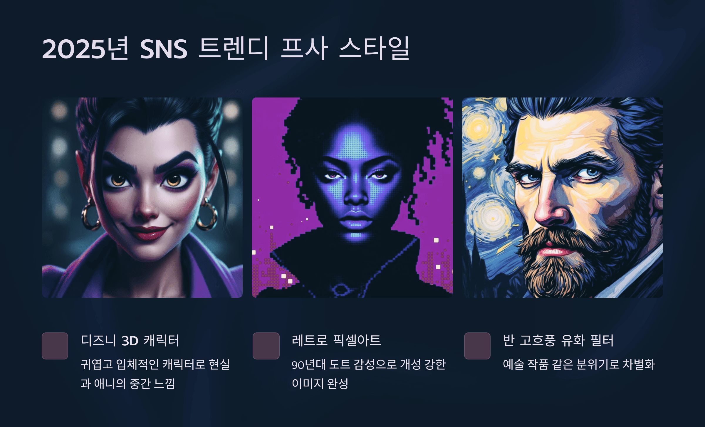 새로운 스타일이 계속 등장하고 있어요. 지금 가장 인기 있는 AI 프사 트렌드는 다음과 같아요.