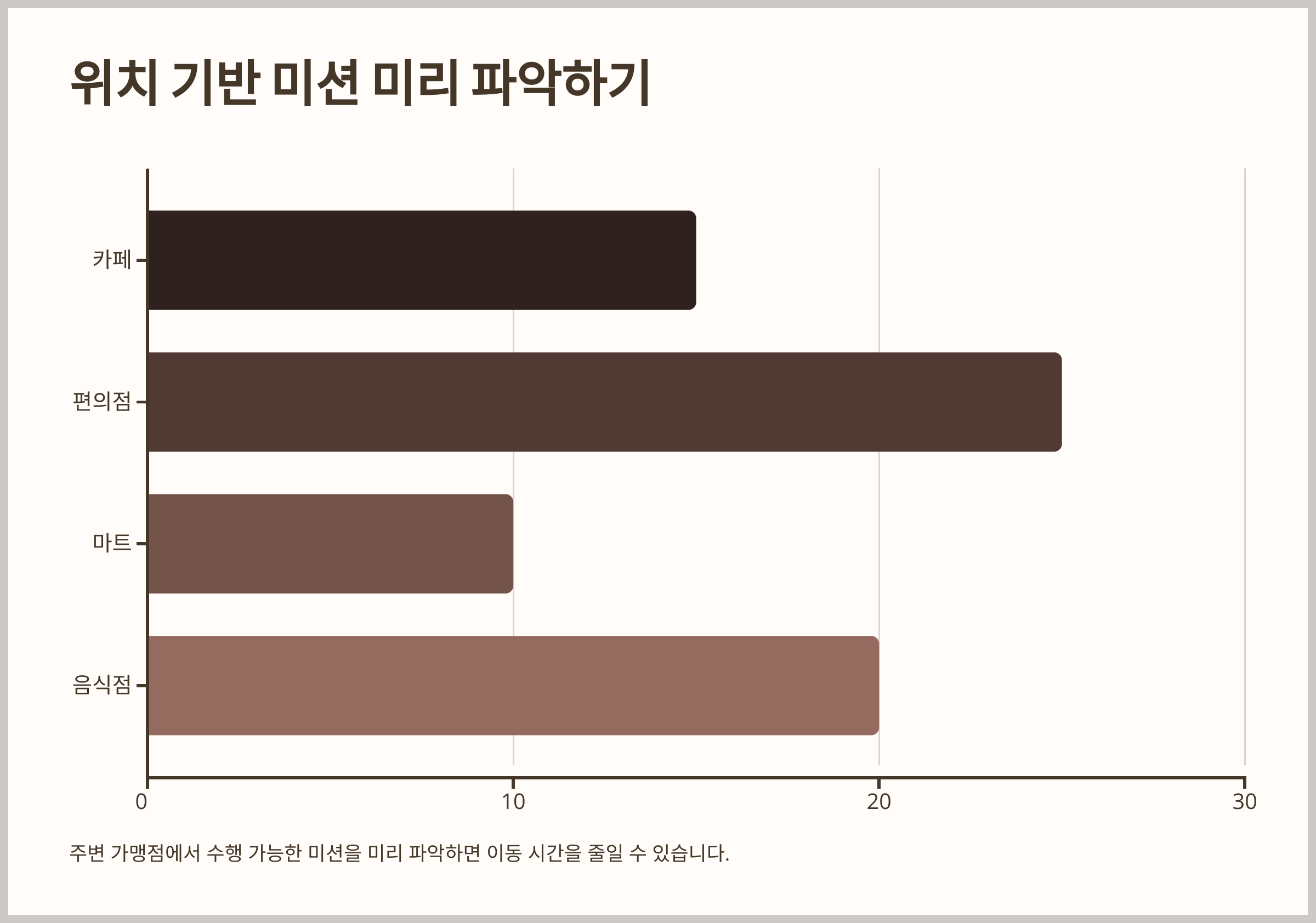 - 주변 가맹점에서 수행 가능한 미션을 미리 파악하면 이동 시간을 줄일 수 있다.