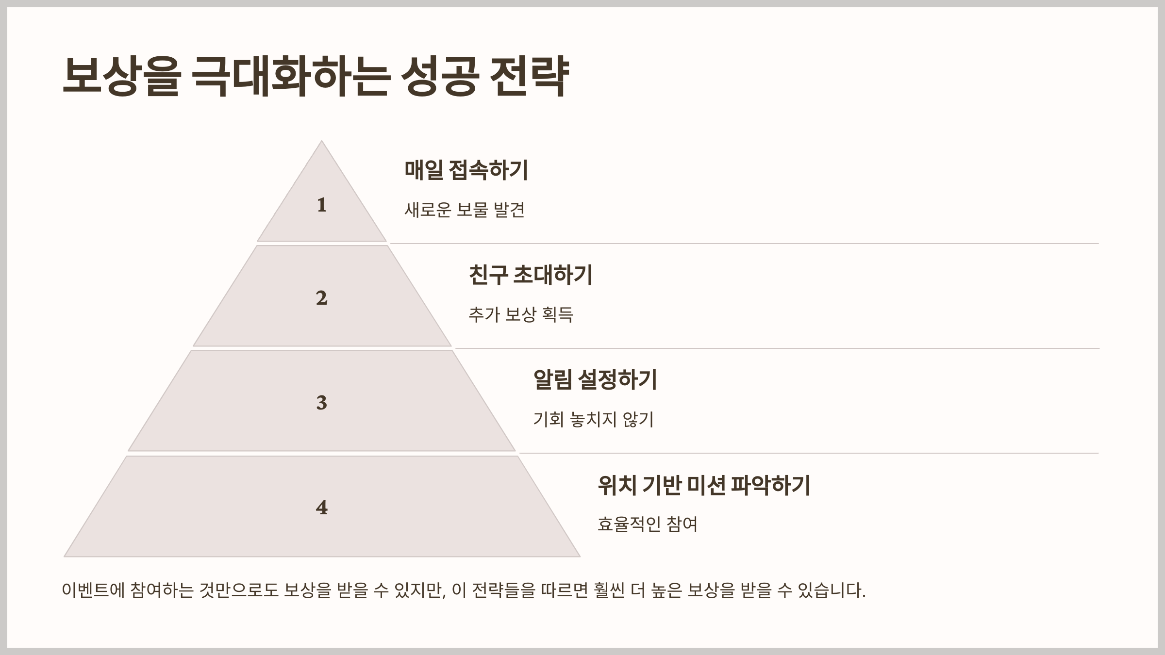 - 매일 새로운 보물이 추가되기 때문에 꾸준히 접속하면 보상 기회를 극대화할 수 있다.