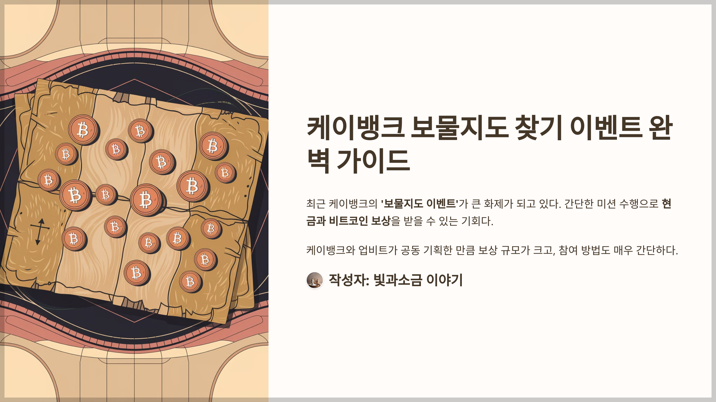 케이뱅크 보물지도 찾기 이벤트 완벽 가이드, 현금과 비트코인 잡아라입니다. 최근 케이뱅크의 '보물지도 이벤트'가 큰 화제가 되고 있다. 간단한 미션을 수행하거나 친구에게 링크를 공유하면 현금과 비트코인 보상을 받을 수 있는 기회다.