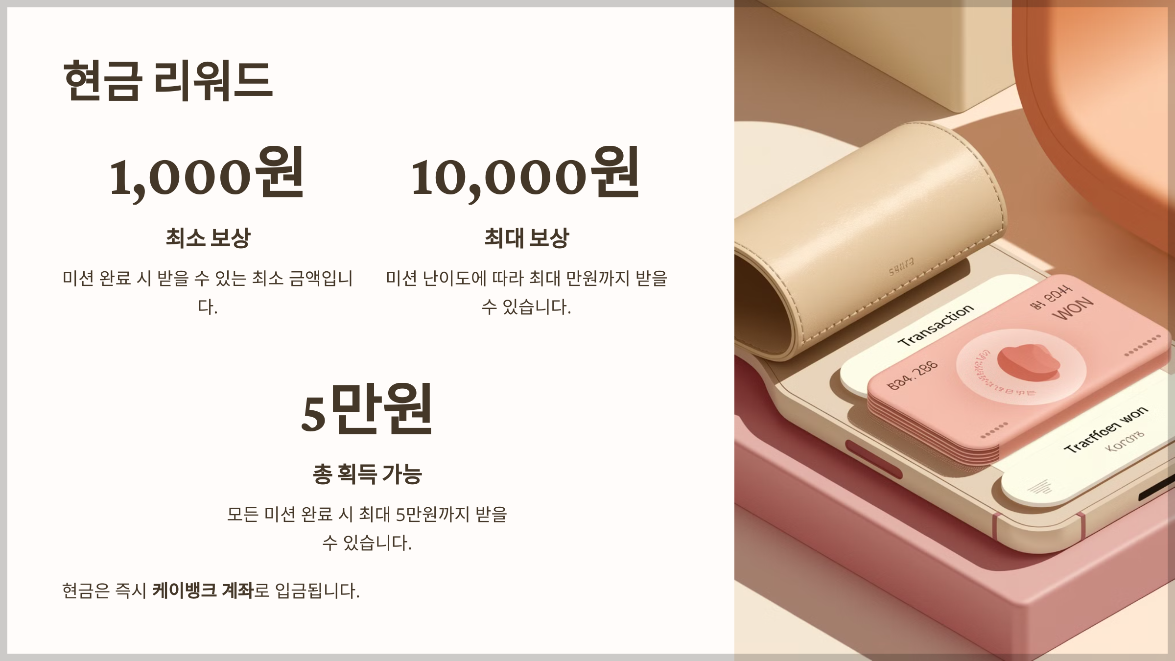 - 미션 난이도에 따라 1,000원 ~ 10,000원이 랜덤으로 지급