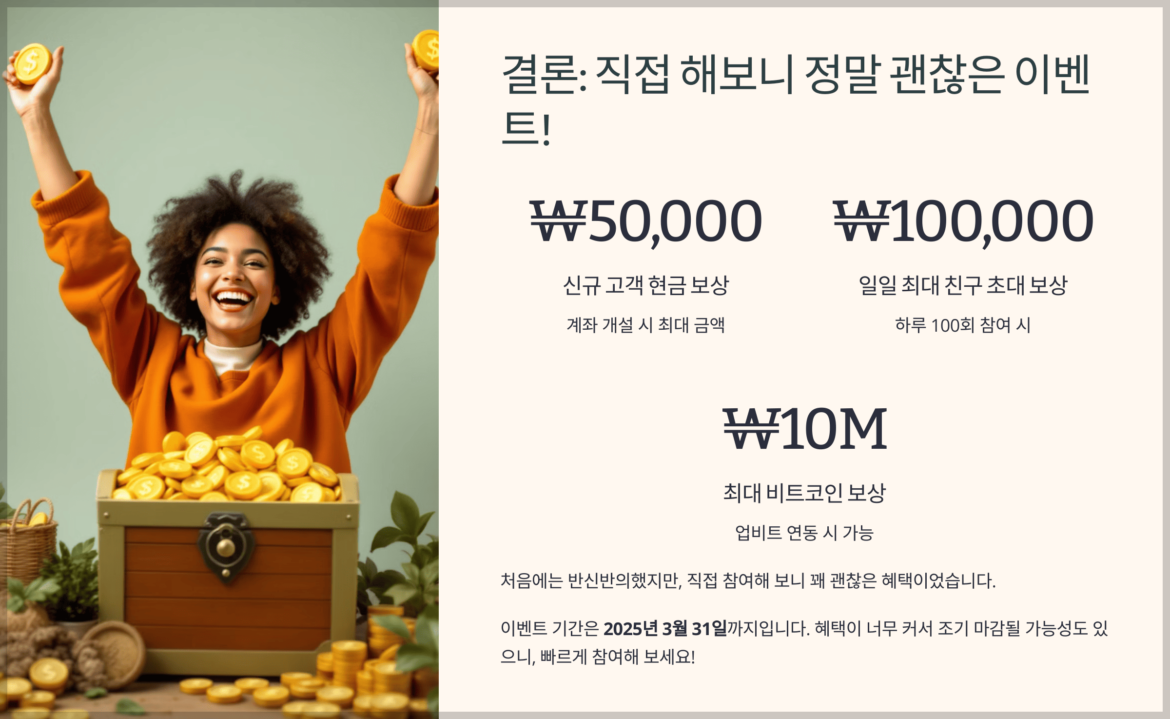 특히 암호화폐 혜택은 업비트 계정을 통해 지급되기 때문에, 암호화폐에 관심이 있는 사람이라면 더 매력적으로 느껴질 수 있습니다.