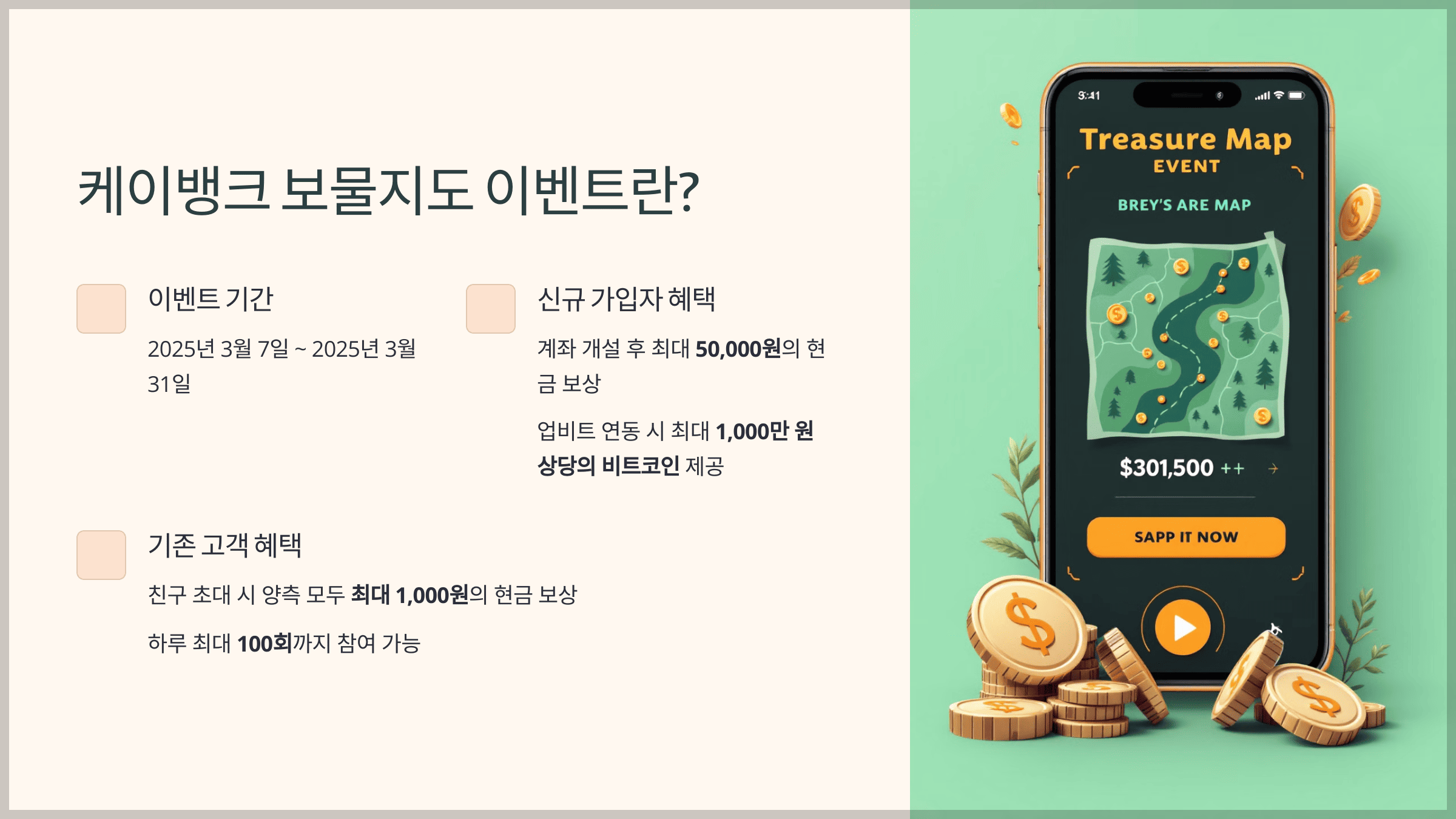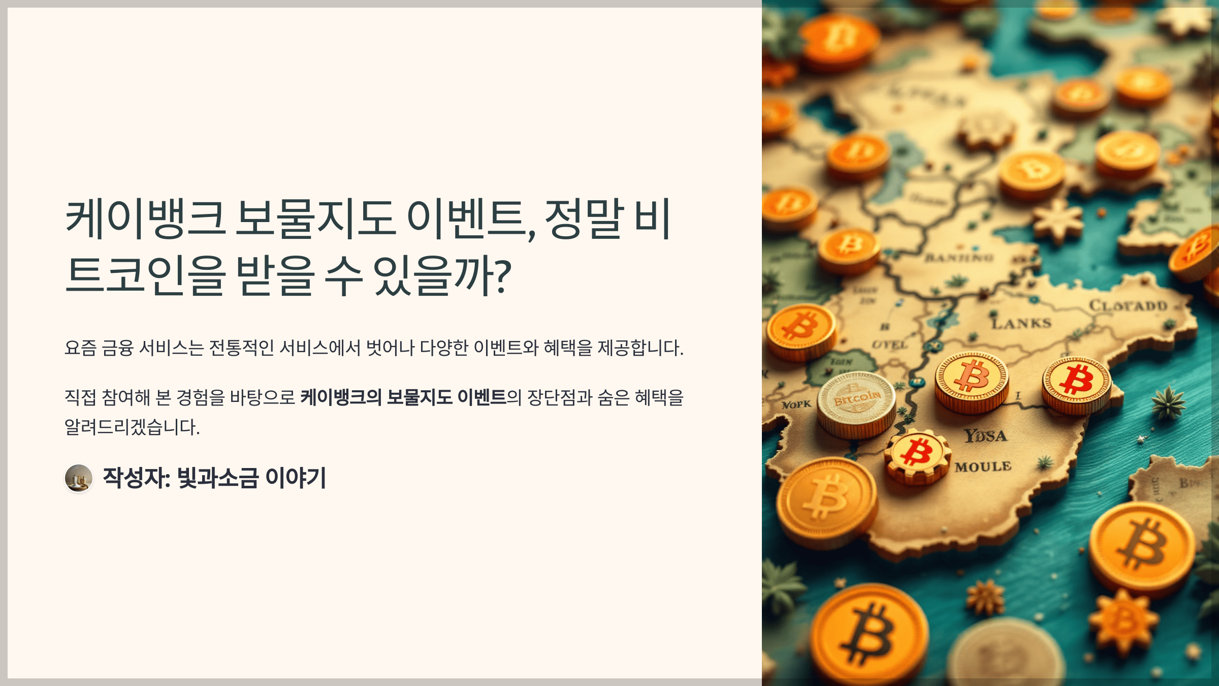 케이뱅크 보물지도 이벤트, 정말 비트코인을 받을 수 있을까? 요즘 금융 서비스는 예금이나 대출 같은 전통적인 서비스에서 벗어나, 고객 유치를 위해 다양한 이벤트와 혜택을 제공합니다. 최근 케이뱅크의 보물지도 이벤트가 특히 주목받고 있는데요.
