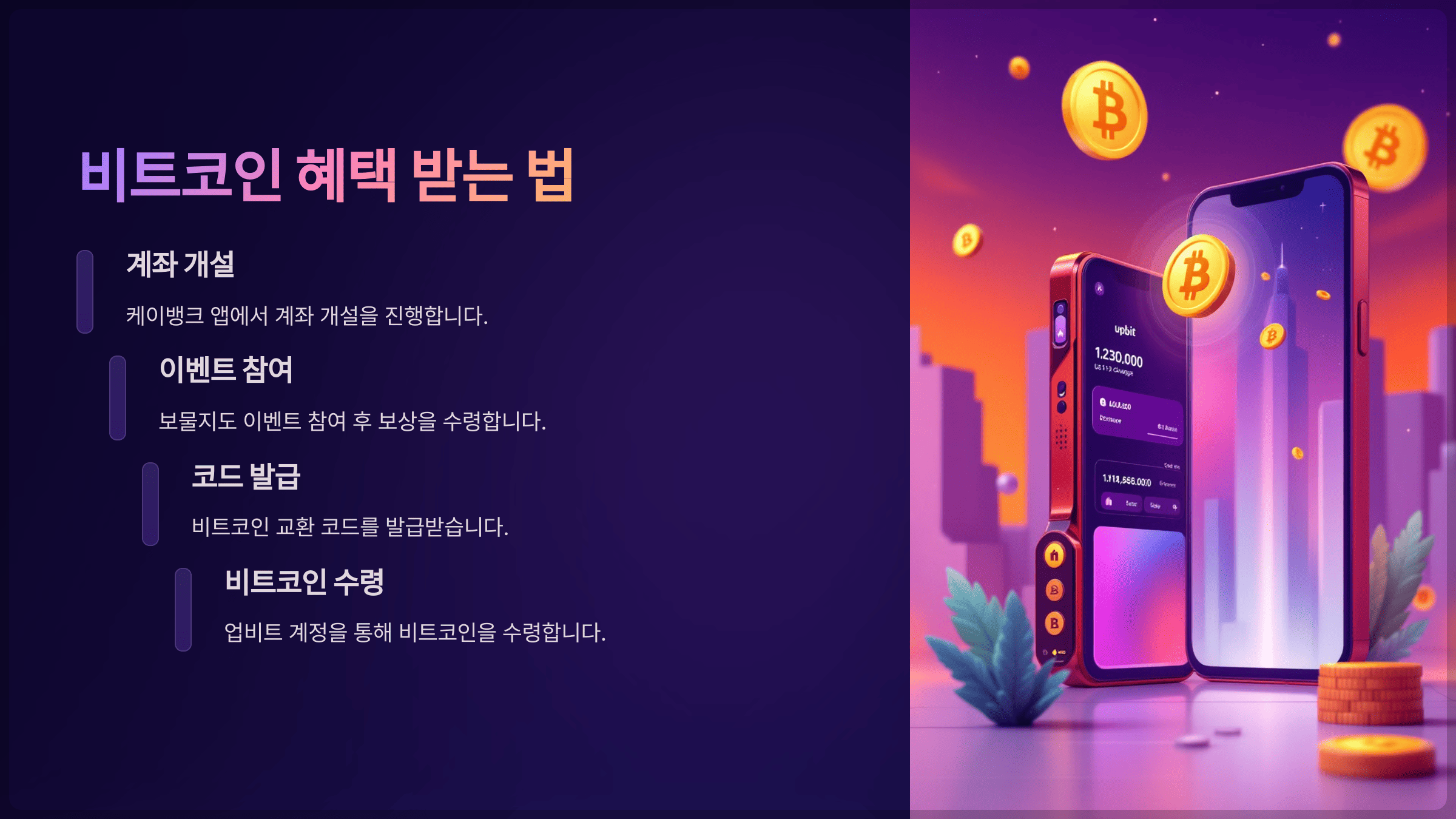 보물지도 이벤트만으로도 충분히 매력적이지만, 케이뱅크는 여기서 멈추지 않았습니다. 최초 계좌 개설 고객에게 비트코인 교환 코드를 추가 지급합니다. 구체적인 참여 방법은 다음과 같습니다.