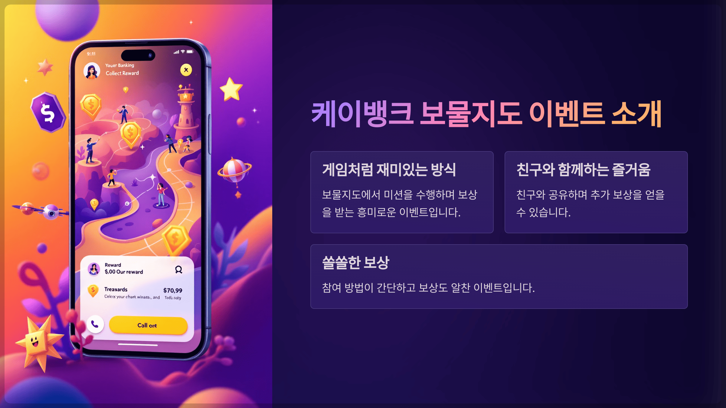 케이뱅크가 봄을 맞아 준비한 ‘보물지도 찾기’ 이벤트는 이름 그대로 숨겨진 보물을 찾는 재미를 선사합니다. 이 이벤트는 단순히 돈을 버는 것이 아니라 게임처럼 흥미로운 방식으로 진행된다는 점에서 특별합니다. 보물지도에서 미션을 수행하면 보상을 받을 수 있을 뿐만 아니라, 친구와 공유하며 추가 보상을 얻을 수 있습니다.