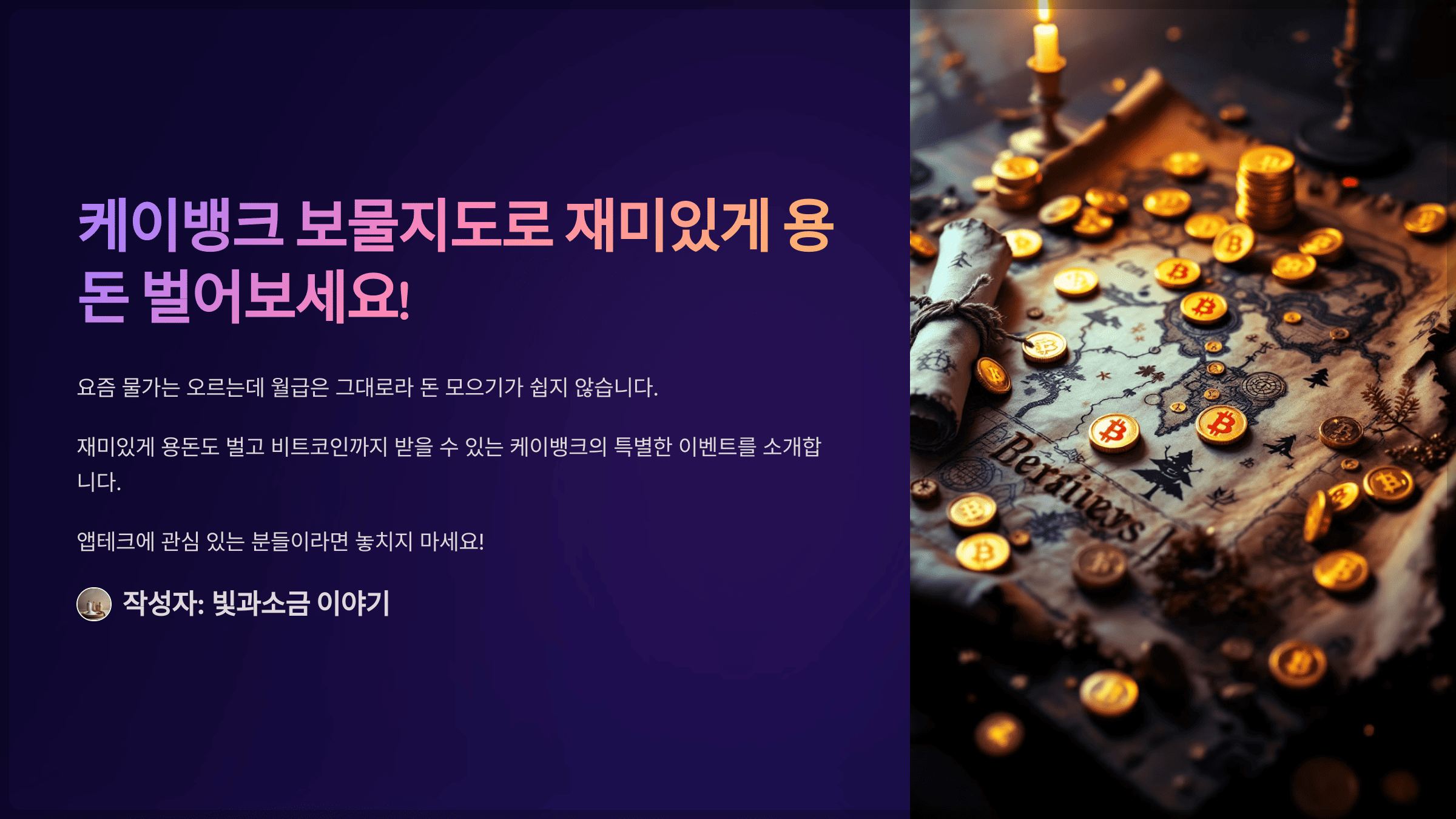 케이뱅크 보물지도 찾기 이벤트 완벽 가이드, 현금과 비트코인 잡아라입니다. 최근 케이뱅크의 '보물지도 이벤트'가 큰 화제가 되고 있다. 간단한 미션을 수행하거나 친구에게 링크를 공유하면