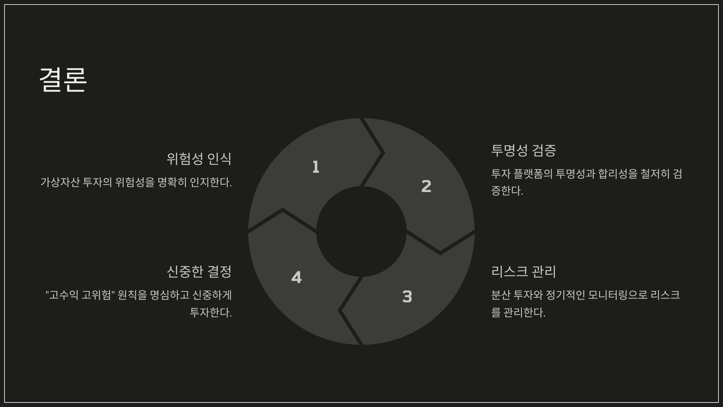 투자 시에는 반드시 투명성과 합리성을 검증하고, 리스크 관리에 철저해야 한다. 가상자산은 여전히 높은 성장 가능성을 가진 시장이지만, "고수익 고위험"이라는 원칙을 명심하고 신중한 투자 결정을 내리는 것이 중요하다.