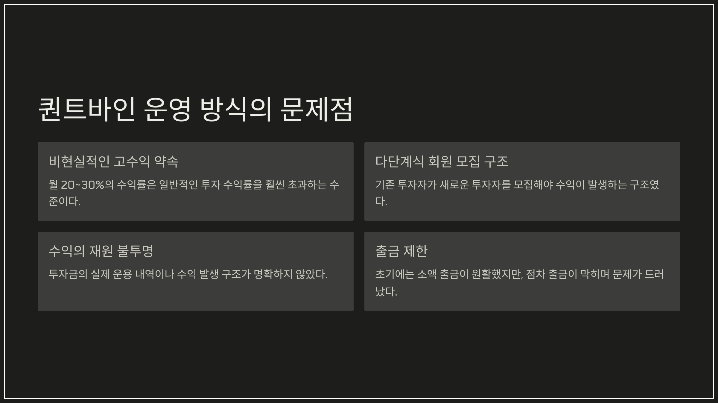 결국 퀀트바인은 신규 투자금으로 기존 투자자의 수익을 지급하면서 구조적으로 지속 불가능한 상태에 이르렀다.