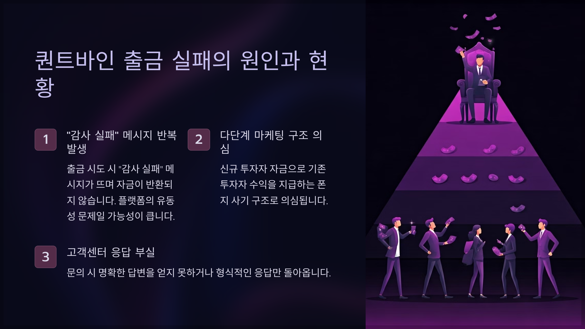 퀀트바인의 자금 유동성 문제, 플랫폼의 감사 시스템 문제, 다단계 마케팅 구조가 원인일 수 있다.