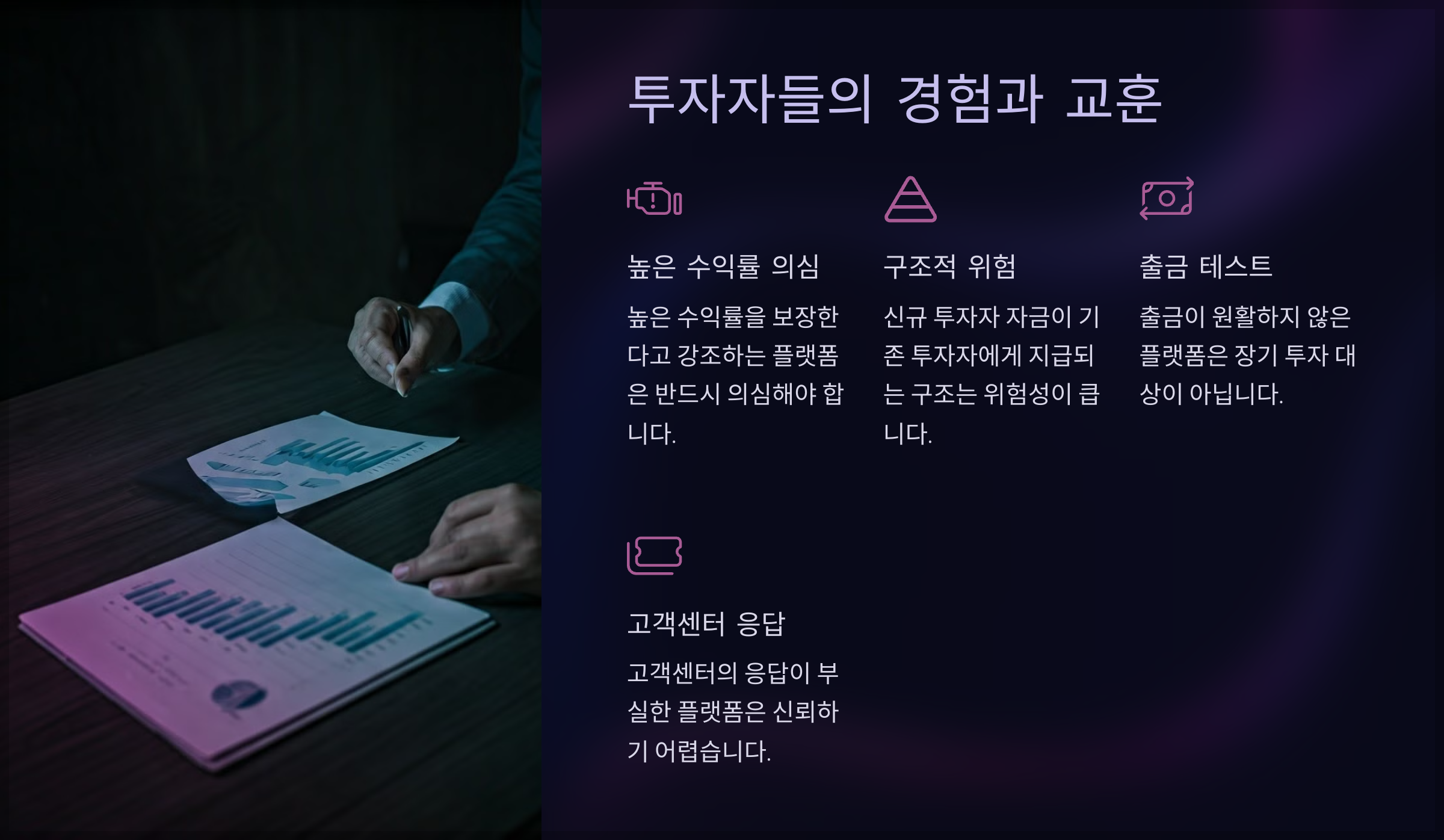 - 출금이 원활하지 않은 플랫폼은 장기 투자 대상이 아니다.