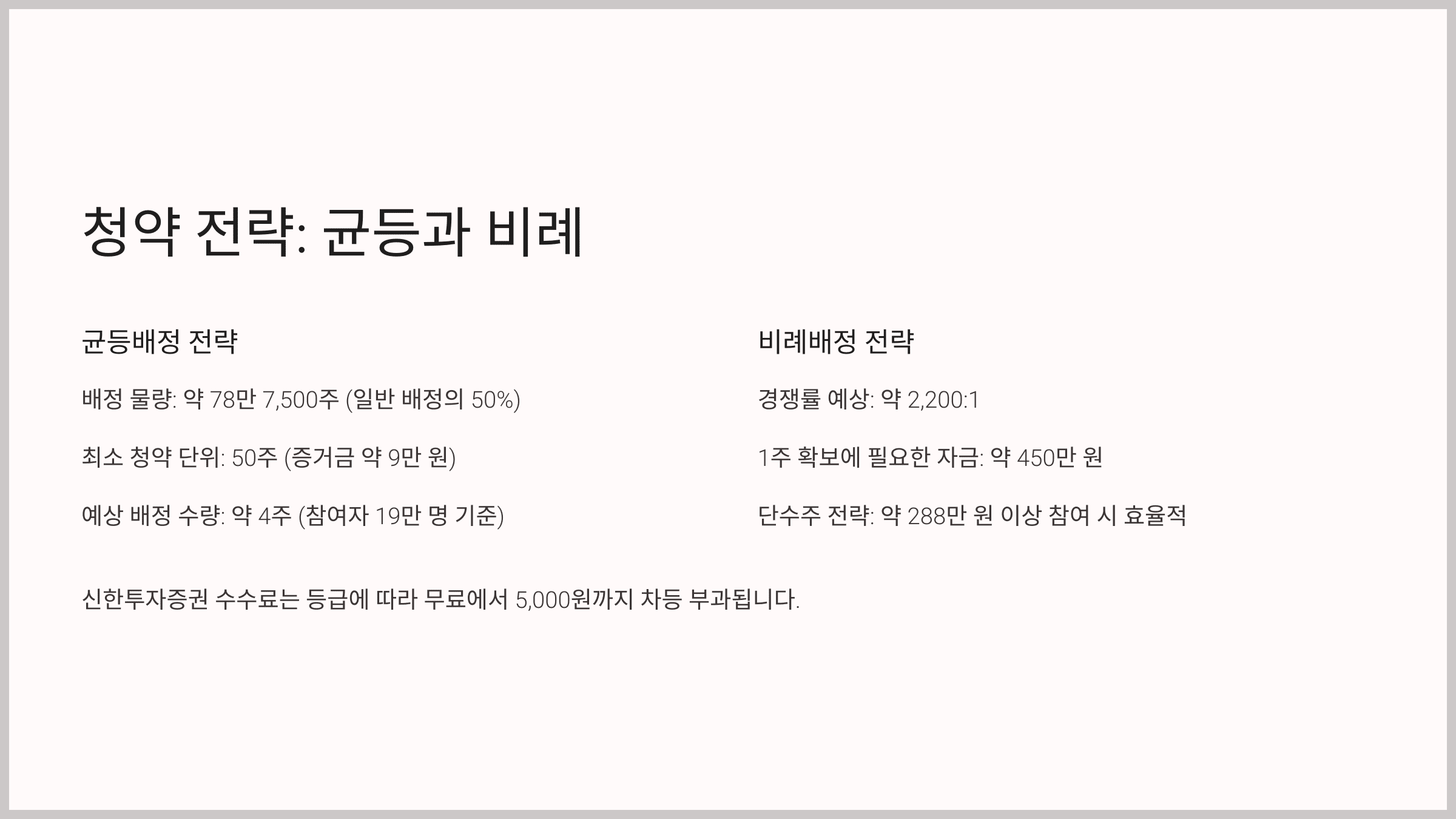 - 단수주 전략: 약 288만 원 이상 참여 시 효율적인 배정 가능