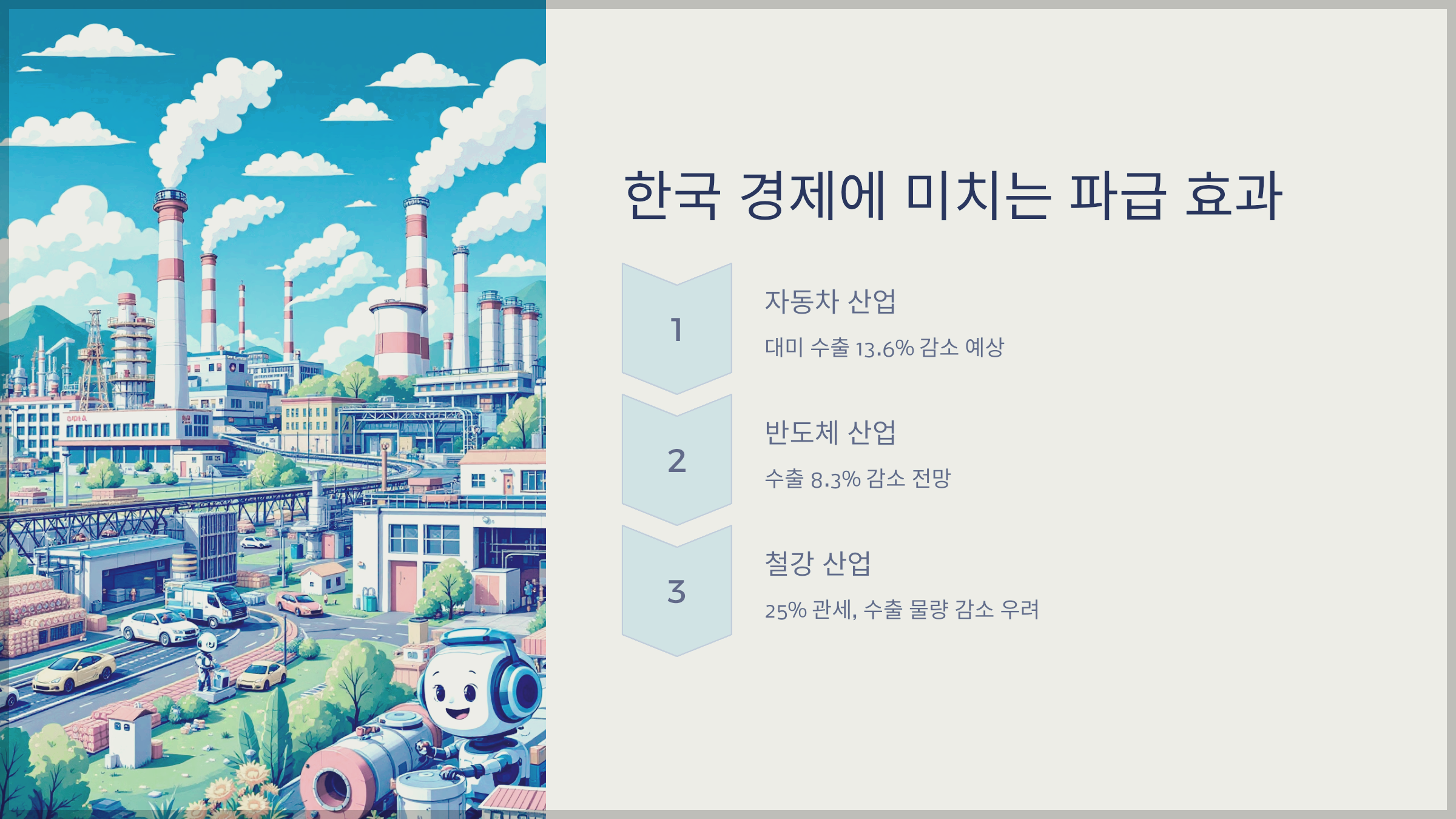 - 반도체는 한국 전체 수출에서 큰 비중을 차지하며, 대미 수출 감소가 약 8.3%에 이를 것이라는 전망이 있다.