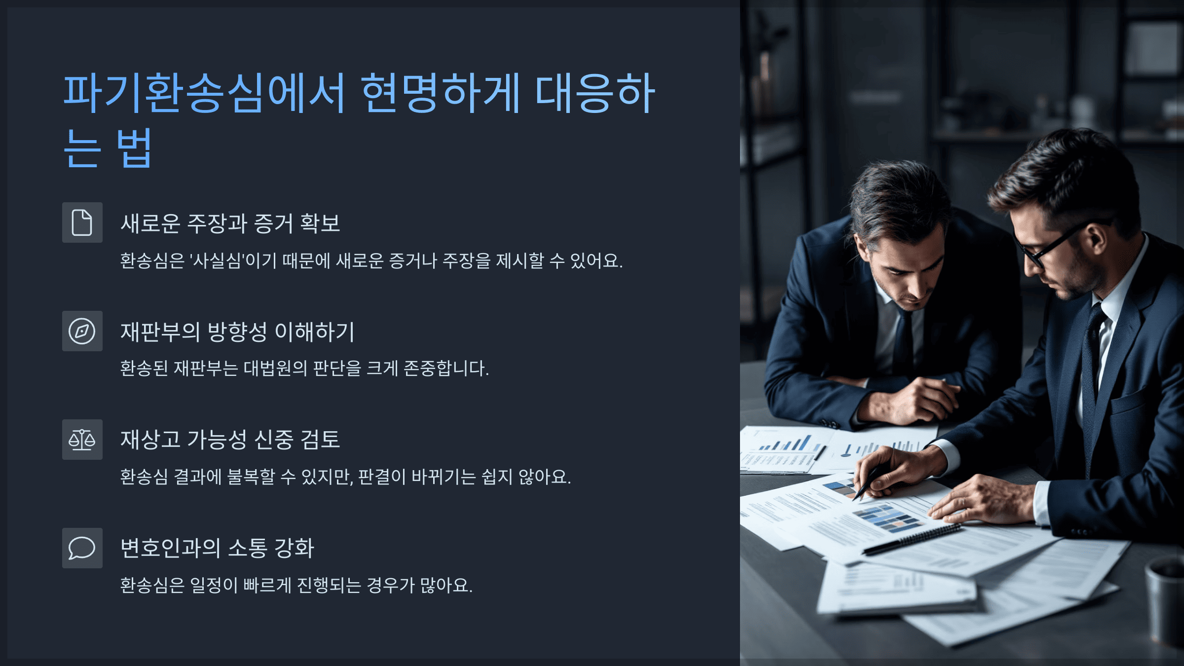 환송심은 일정이 빠르게 진행되는 경우가 많아요. 변호인과 수시로 소통하며 준비 과정을 긴밀히 체크하는 것이 승부를 가를 수 있어요.
