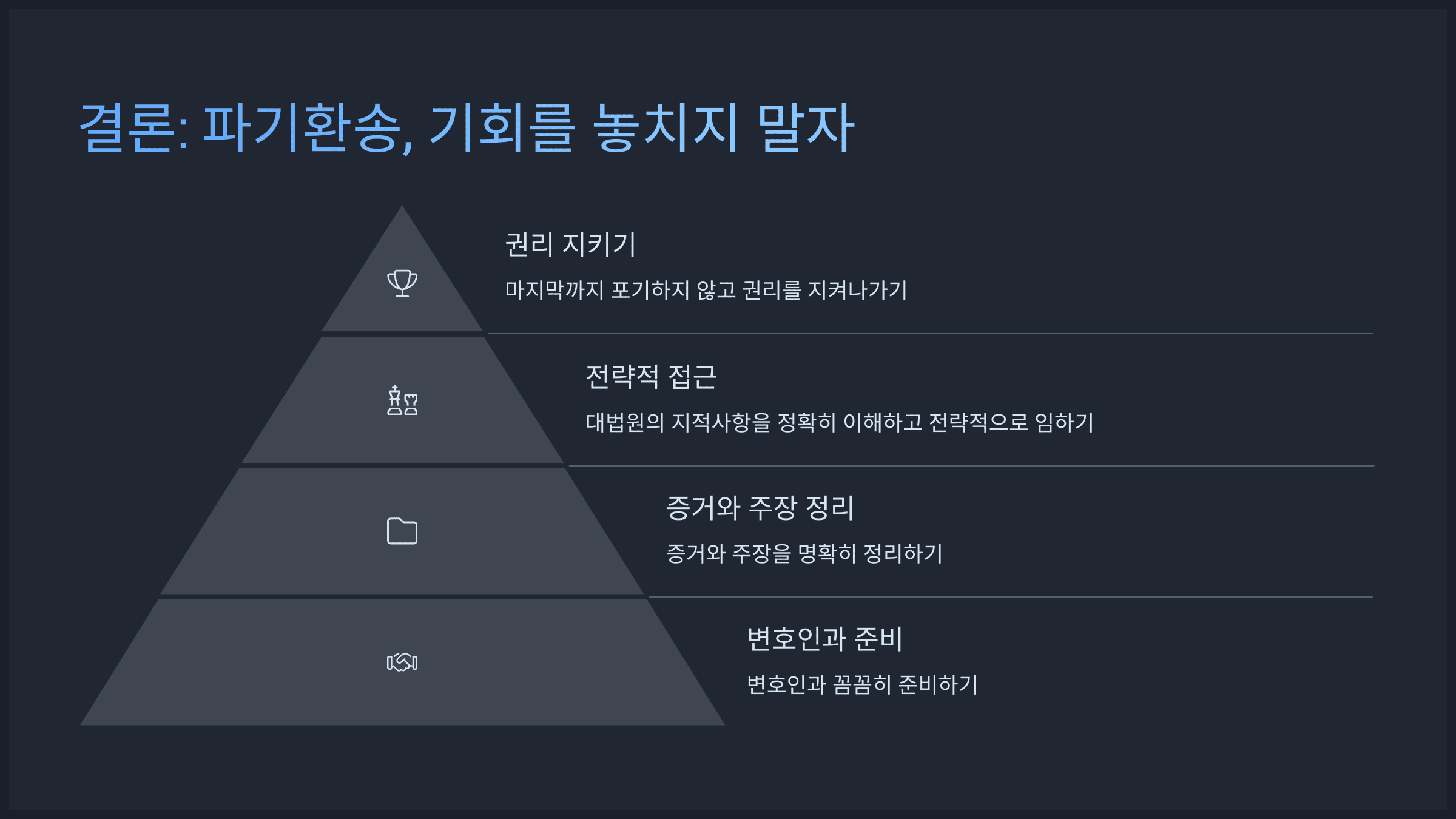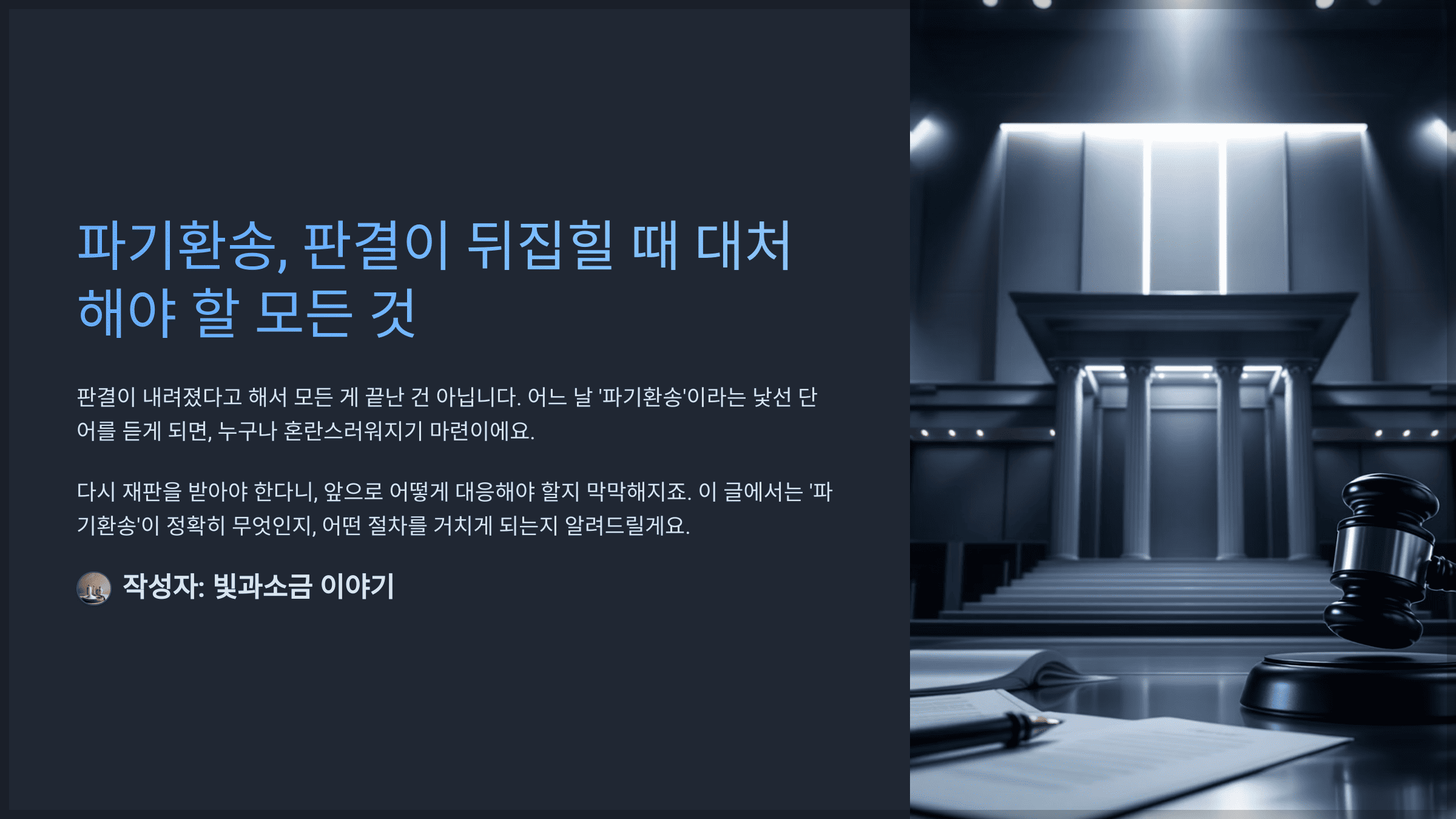 다시 재판을 받아야 한다니, 앞으로 어떻게 대응해야 할지 막막해지죠. 이 글에서는 '파기환송'이 정확히 무엇인지, 어떤 절차를 거치게 되는지, 그리고 이 상황에서 현명하게 준비하는 방법까지 자세히 알려드릴게요.