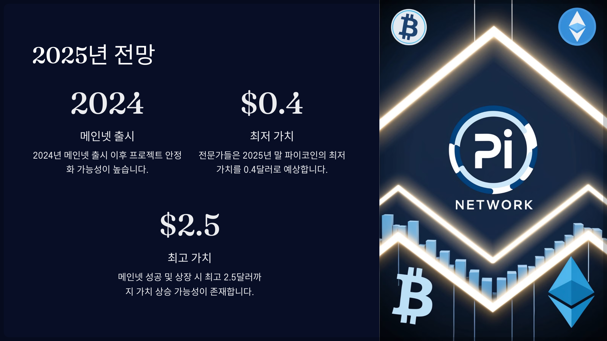 - 전문가들은 2025년 말 파이코인의 가치가 최저 0.4달러 ~ 최고 2.5달러에 이를 것으로 예상