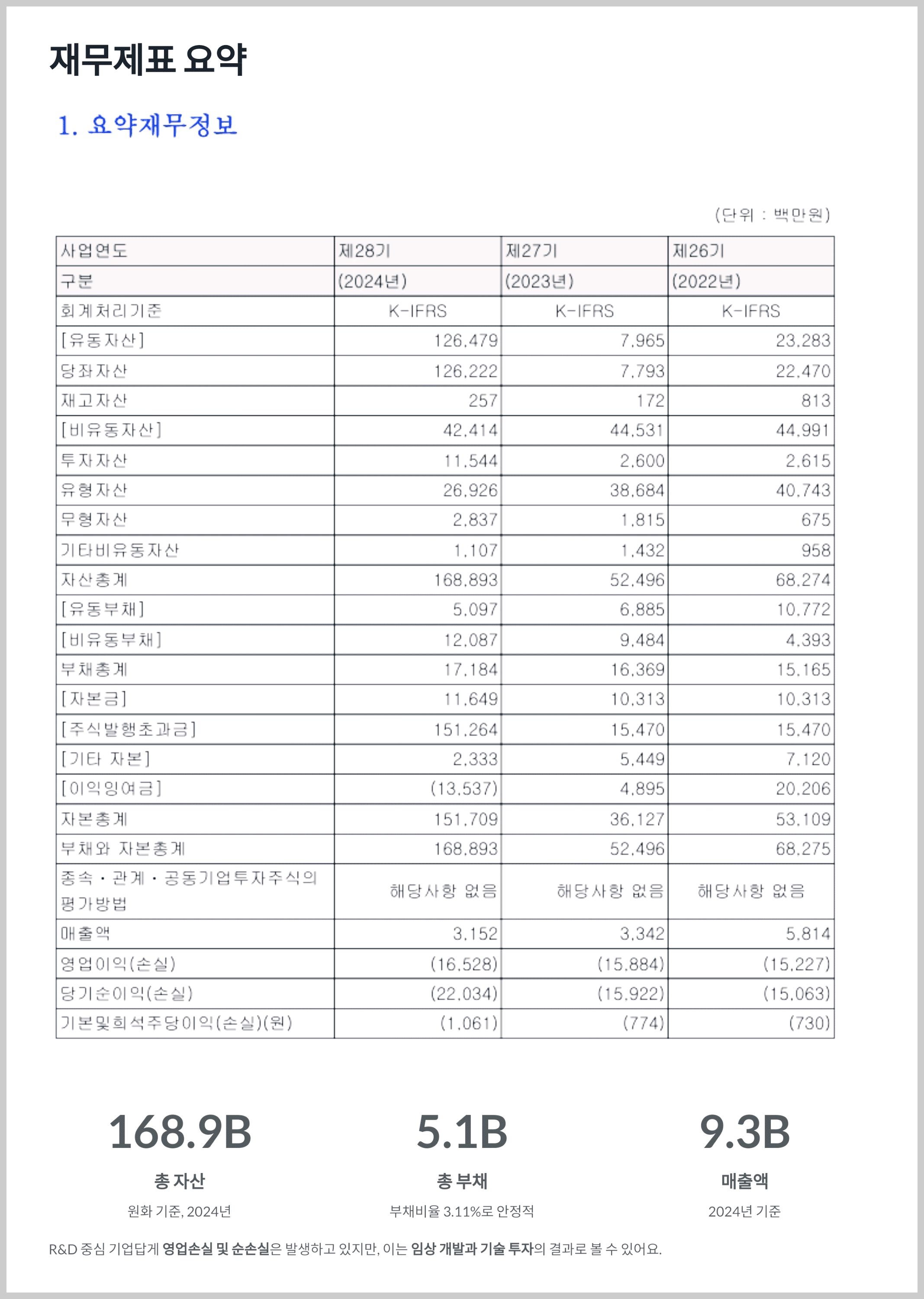 - R&D 중심 기업답게 영업손실 및 순손실은 발생하고 있지만, 이는 임상 개발과 기술 투자의 결과로 볼 수 있어요.