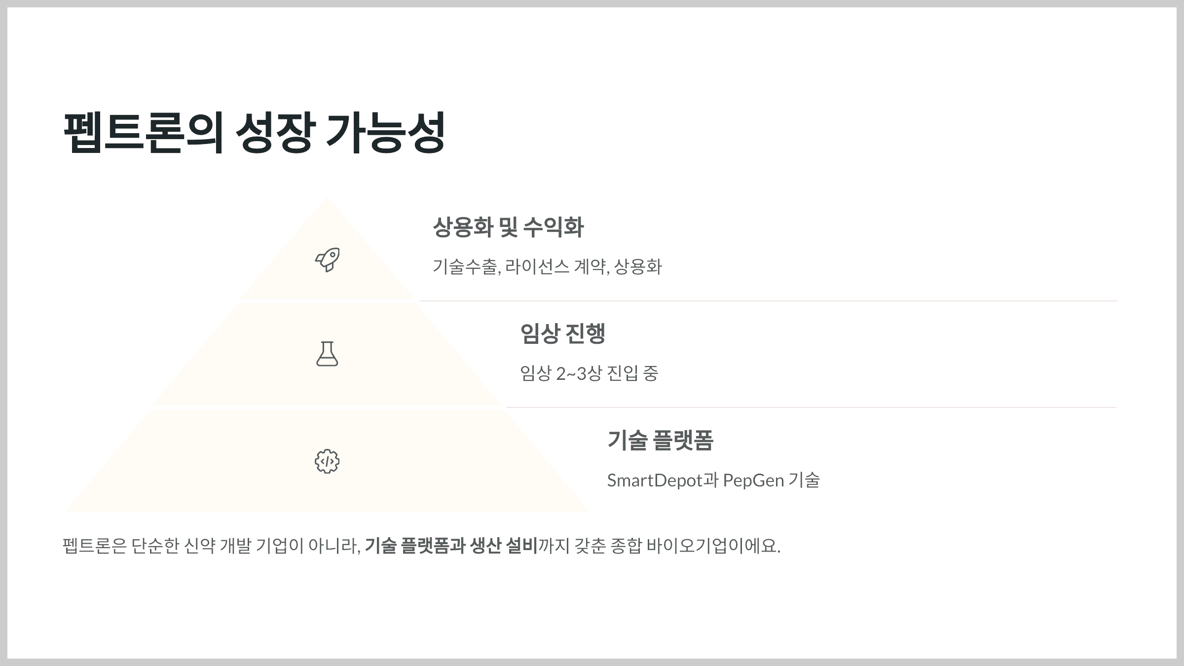 펩트론은 단순한 신약 개발 기업이 아니라, 기술 플랫폼과 생산 설비까지 갖춘 종합 바이오기업이에요.