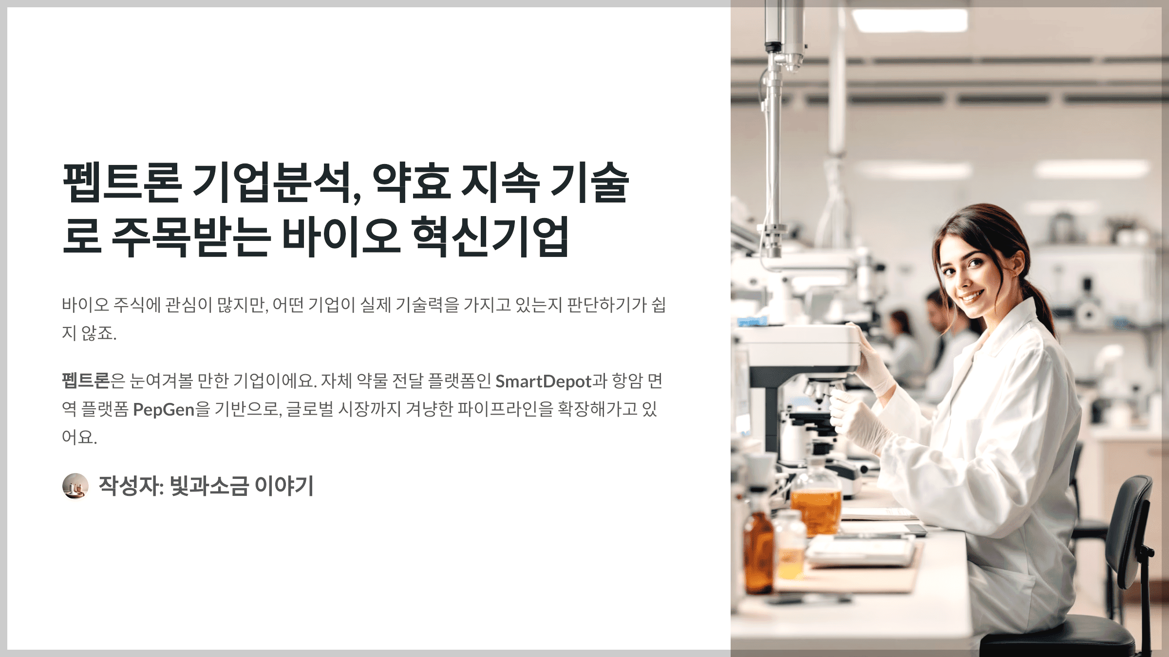 그런 점에서 펩트론은 눈여겨볼 만한 기업이에요. 자체 약물 전달 플랫폼인 SmartDepot과 항암 면역 플랫폼 PepGen을 기반으로, 글로벌 시장까지 겨냥한 파이프라인을 확장해가고 있어요.