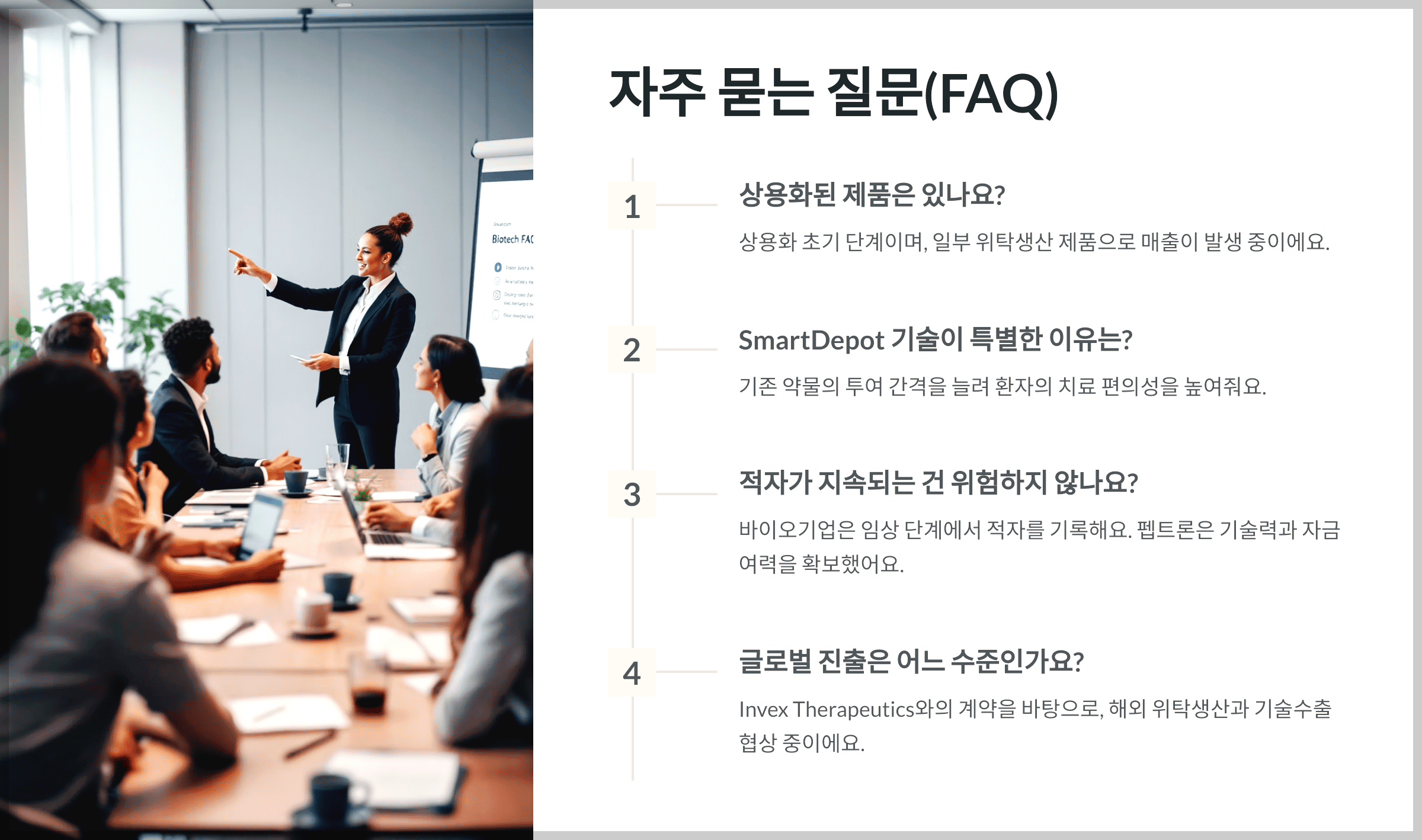 → 대부분의 바이오기업은 임상 단계에서 적자를 기록해요. 중요한 건 기술력과 자금 여력인데, 펩트론은 두 가지 모두 확보하고 있어요.
