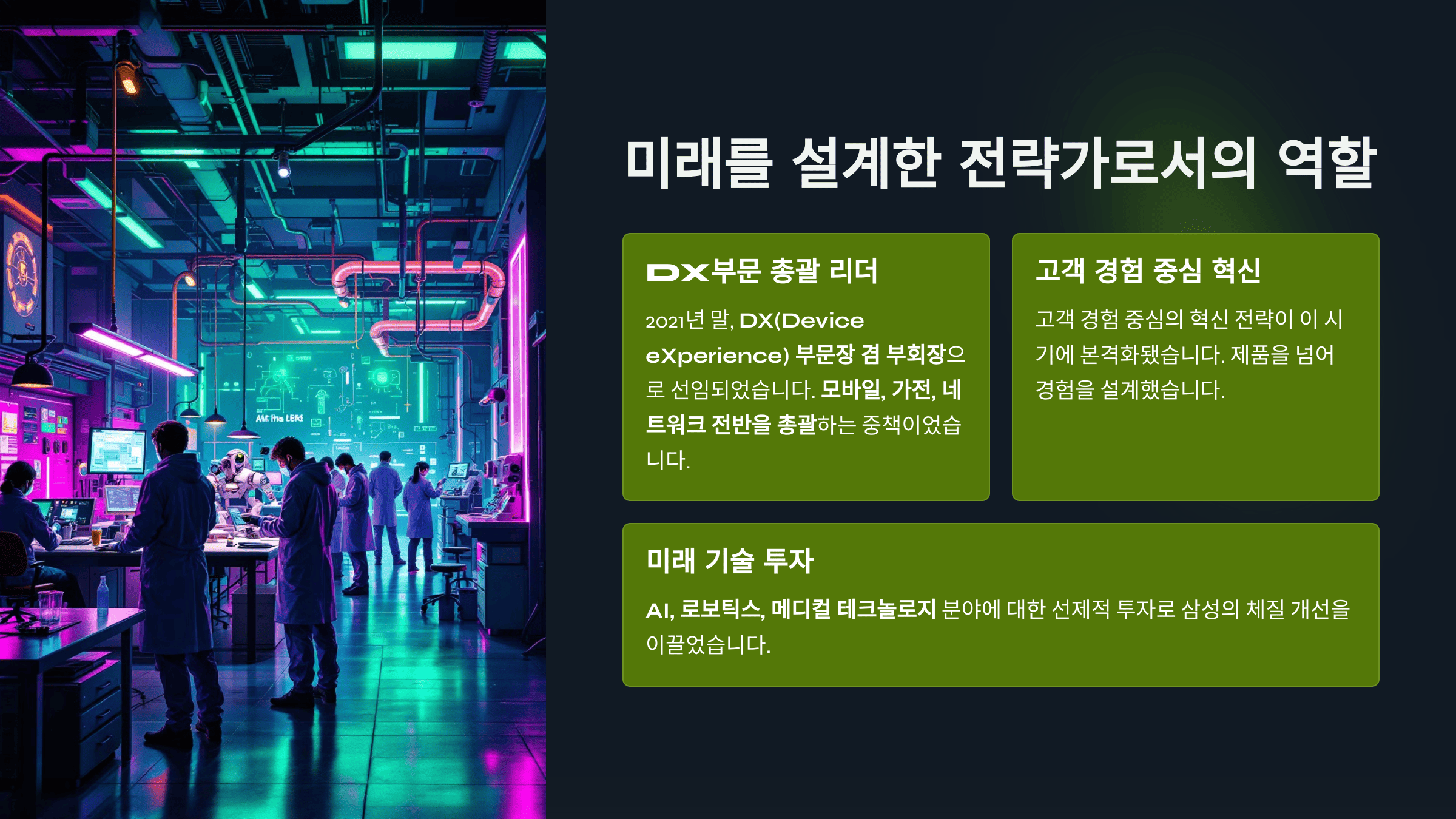 2021년 말, 그는 삼성전자의 DX(Device eXperience) 부문장 겸 부회장으로 선임되었습니다. 이는 단순한 TV 사업만이 아니라, 모바일, 가전, 네트워크 전반을 총괄하는 중책이었습니다. 고객 경험 중심의 혁신 전략이 이 시기에 본격화됐습니다.