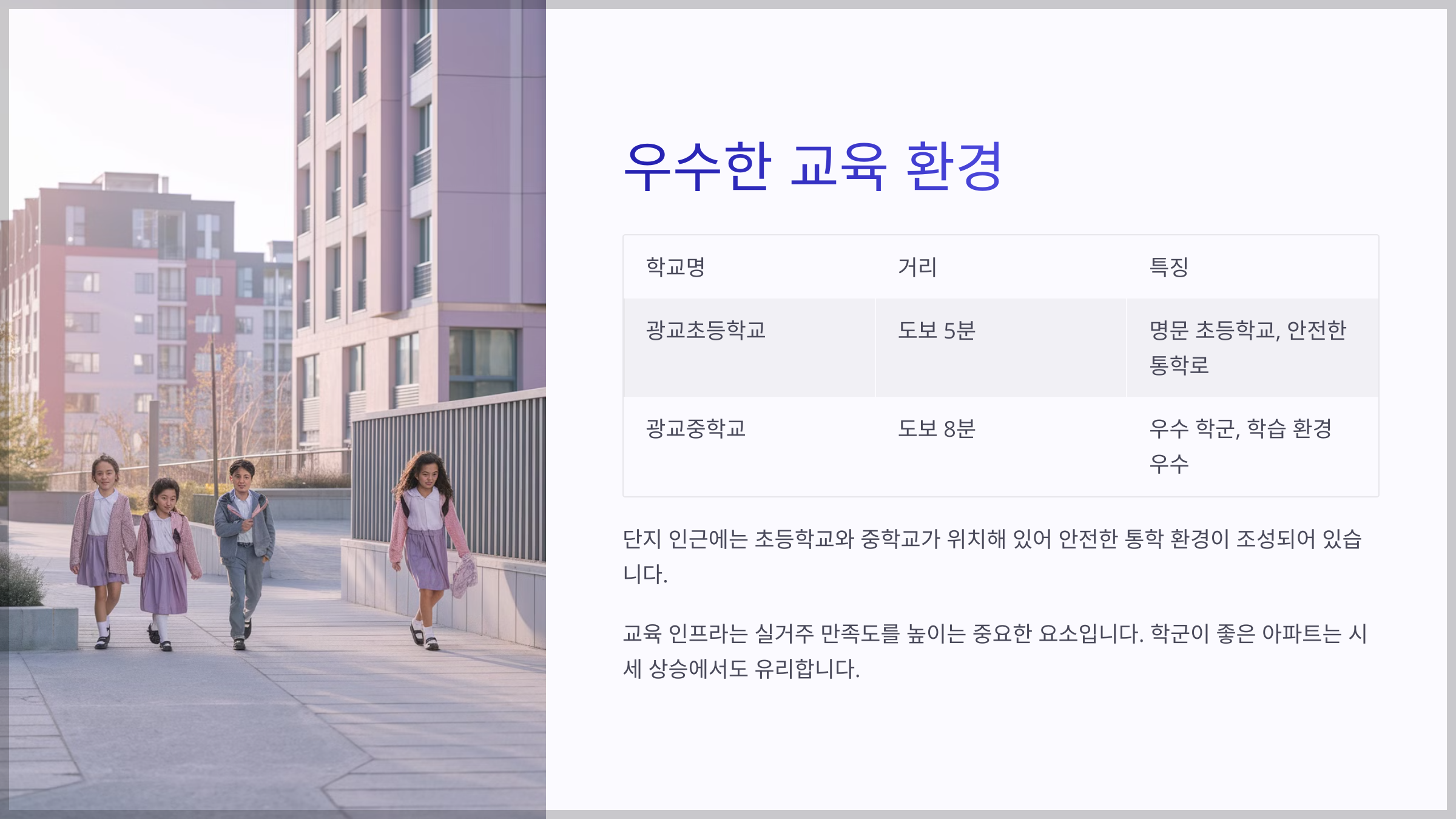 | 광교중학교 | 도보 8분 | 우수 학군, 학습 환경 우수 |