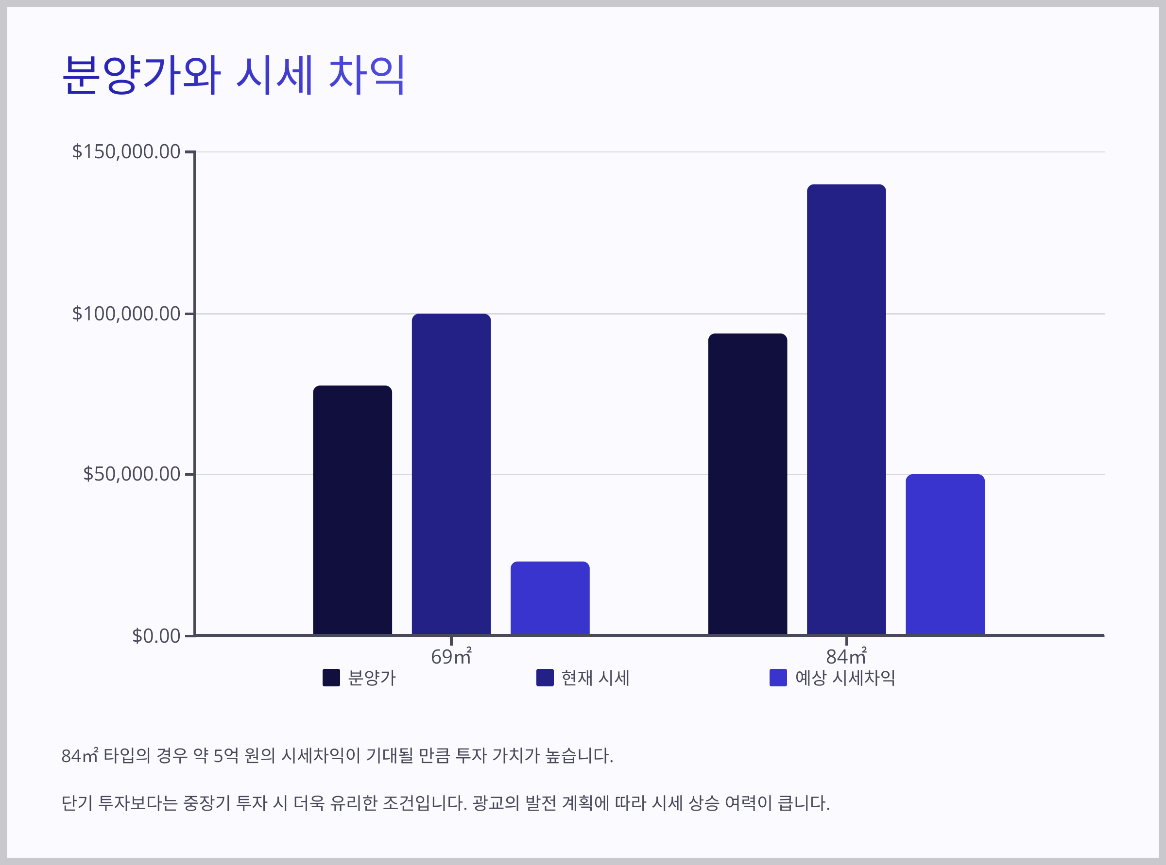 84㎡ 타입의 경우 약 5억 원의 시세차익이 기대될 만큼 투자 가치가 높습니다. 단기 투자보다는 중장기 투자 시 더욱 유리한 조건이며, 광교의 발전 계획에 따라 향후 시세 상승 여력이 큽니다.