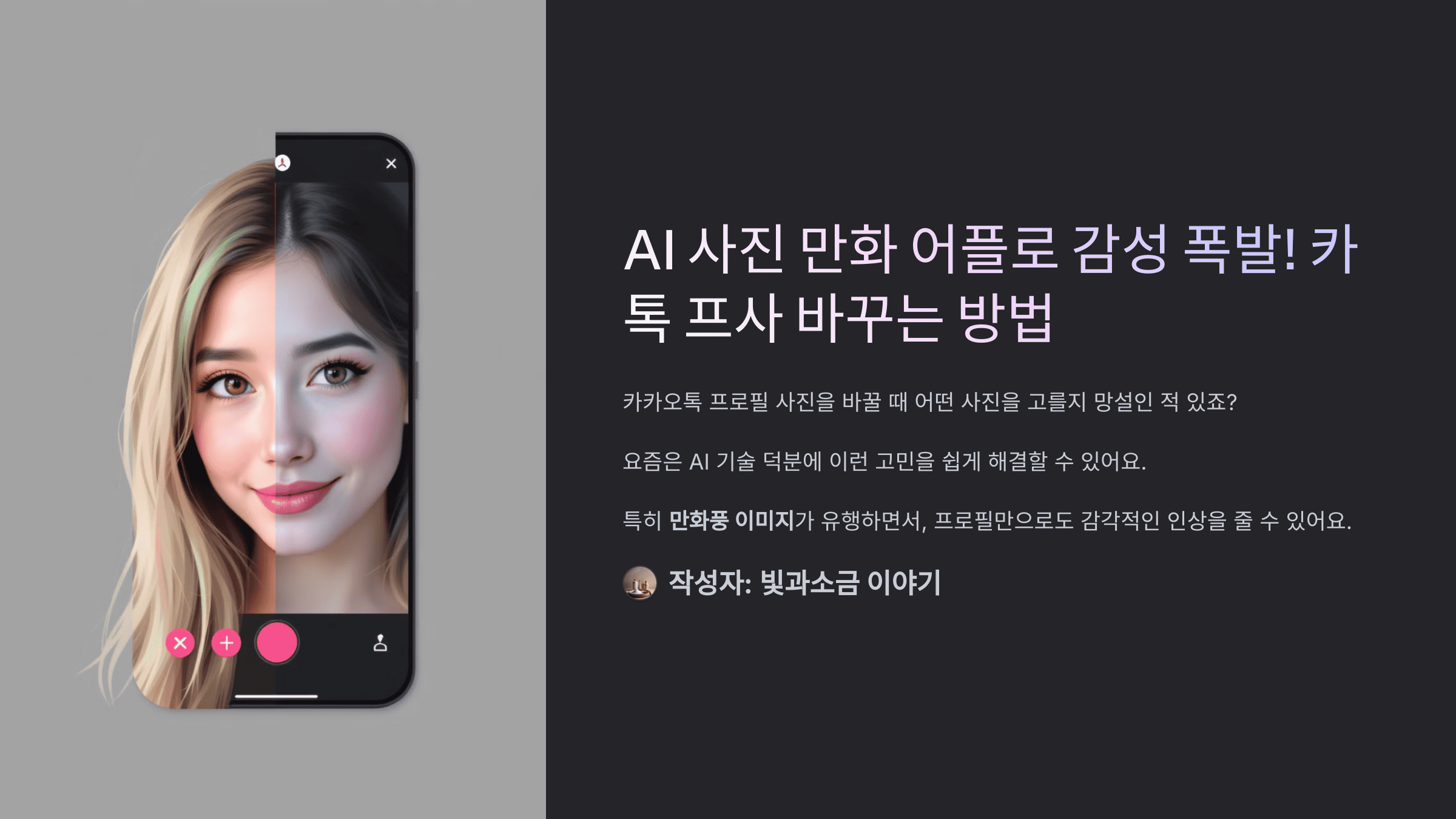 AI 사진 만화 어플로 감성 폭발! 카톡 프사 바꾸는 방법입니다. 카카오톡 프로필 사진을 바꿀 때 어떤 사진을 고를지 망설인 적 있죠? 셀카는 식상하고, 너무 과한 사진은 부담스럽고, 뭔가 특별하면서도 은근한 감성을 담고 싶을 때가 있어요.