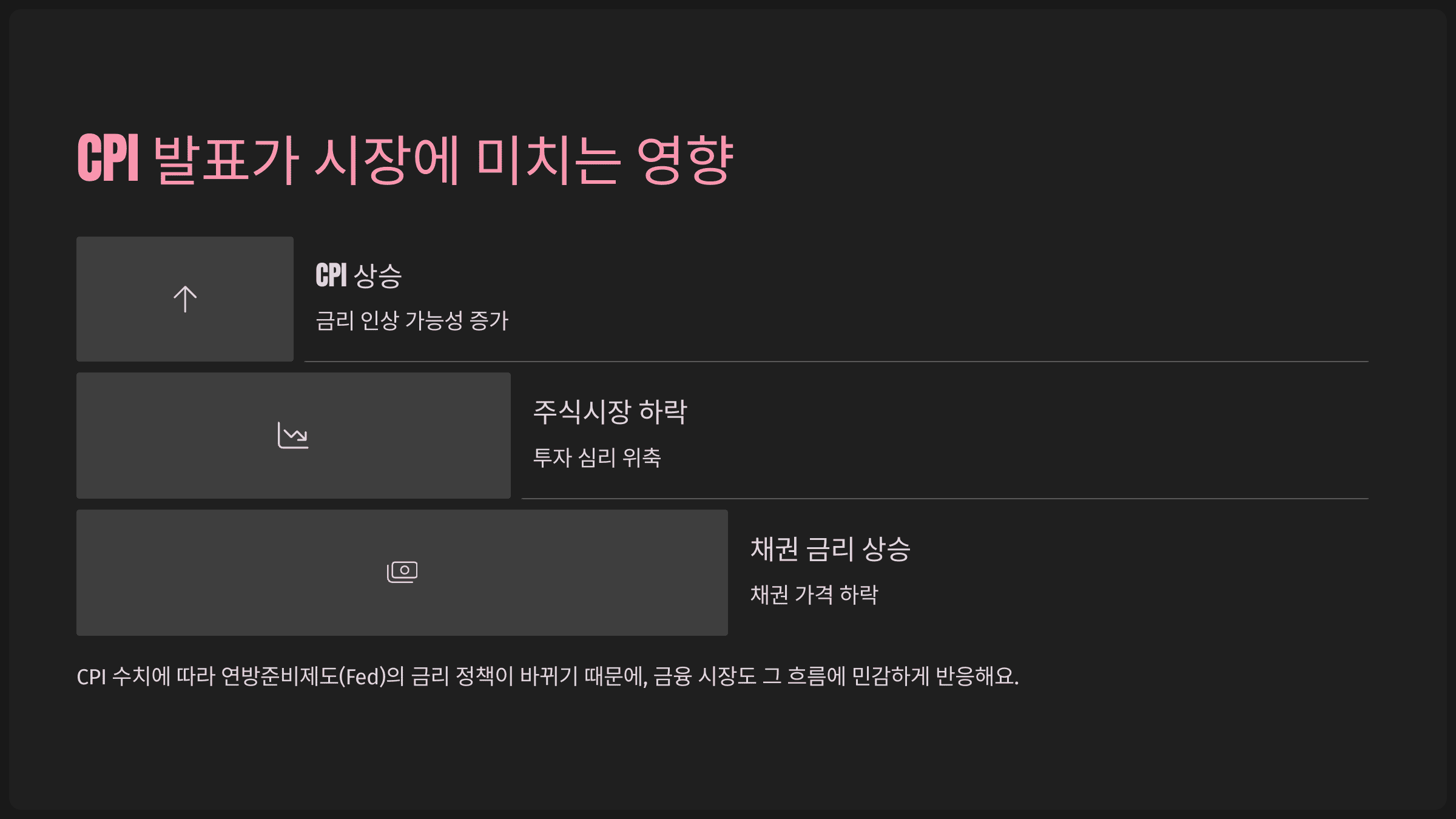 - CPI가 높게 나오면 → 금리 인상 가능성 ↑ → 주식시장 하락, 채권 금리 상승