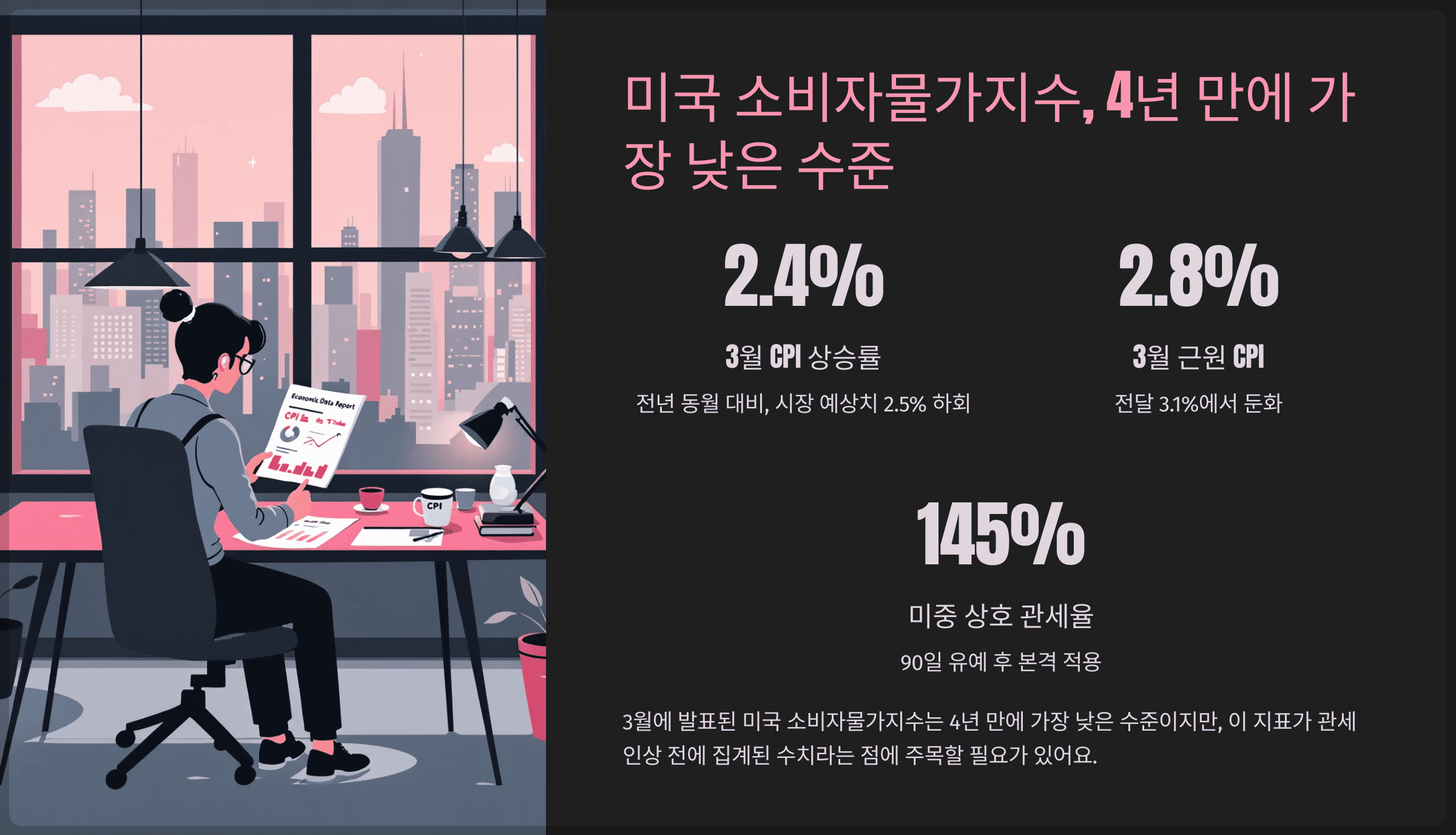 | 3월 근원 CPI | 전년 동월 대비 2.8% 상승 | 전달 대비 둔화 (3.1% → 2.8%) 관세 영향 미반영 |