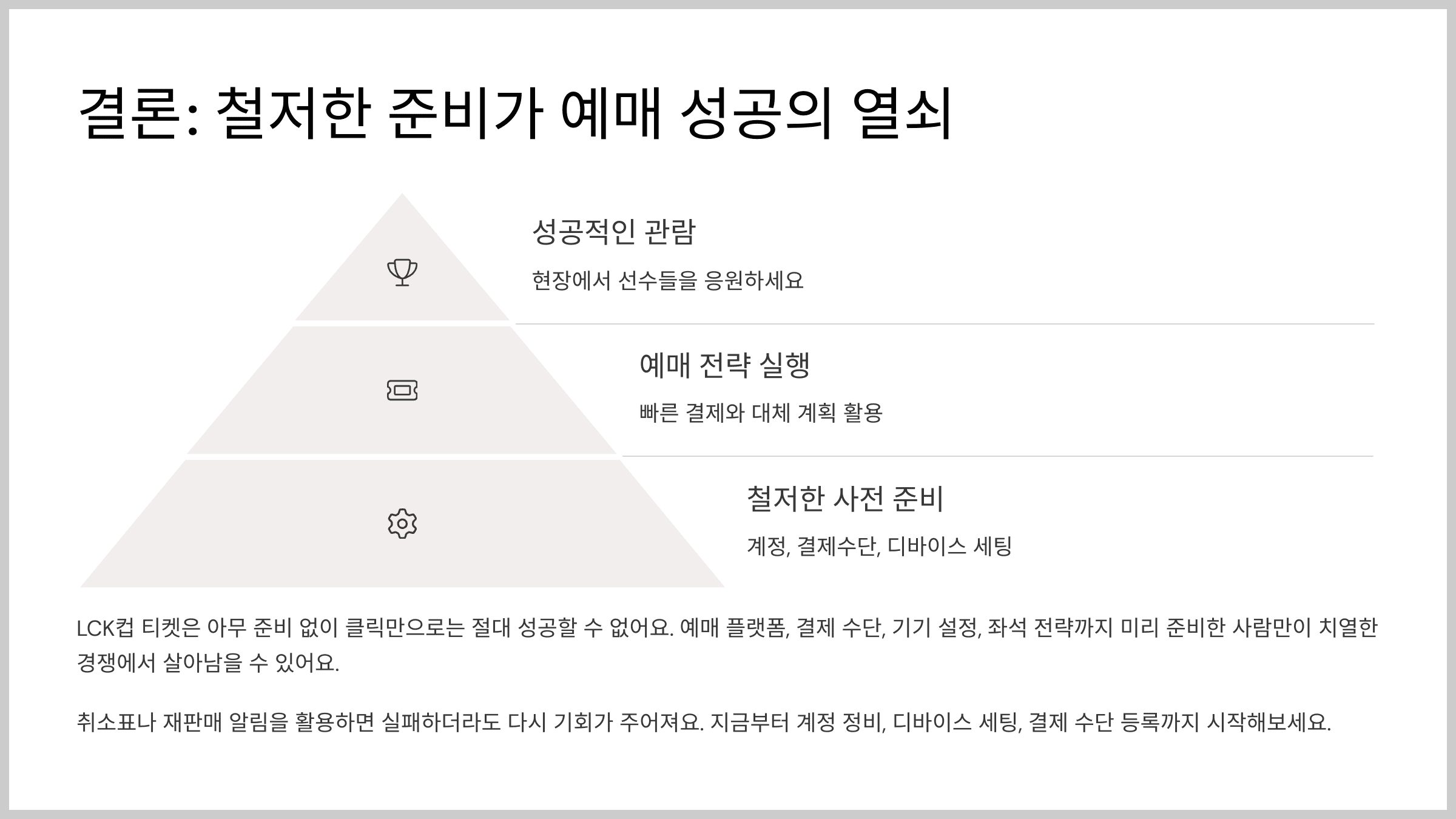 LCK컵 티켓은 아무 준비 없이 클릭만으로는 절대 성공할 수 없어요. 예매 플랫폼, 결제 수단, 기기 설정, 좌석 전략까지 미리 준비한 사람만이 치열한 경쟁에서 살아남을 수 있어요. 취소표나 재판매 알림을 활용하면 실패하더라도 다시 기회가 주어져요.