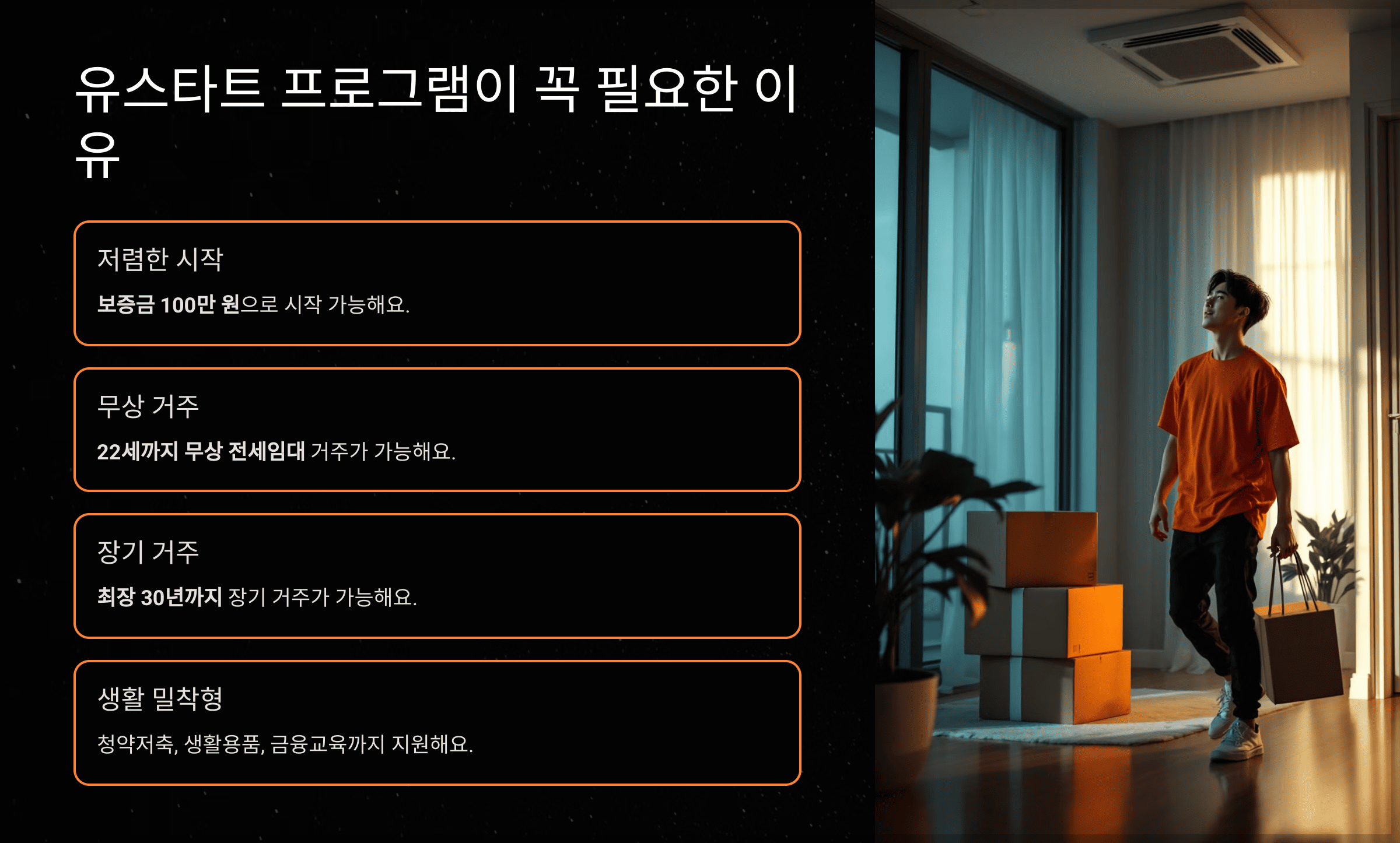유스타트 프로그램은 주거부터 생활 기반까지 실제로 도움이 되는 방식으로 지원해 줘요.