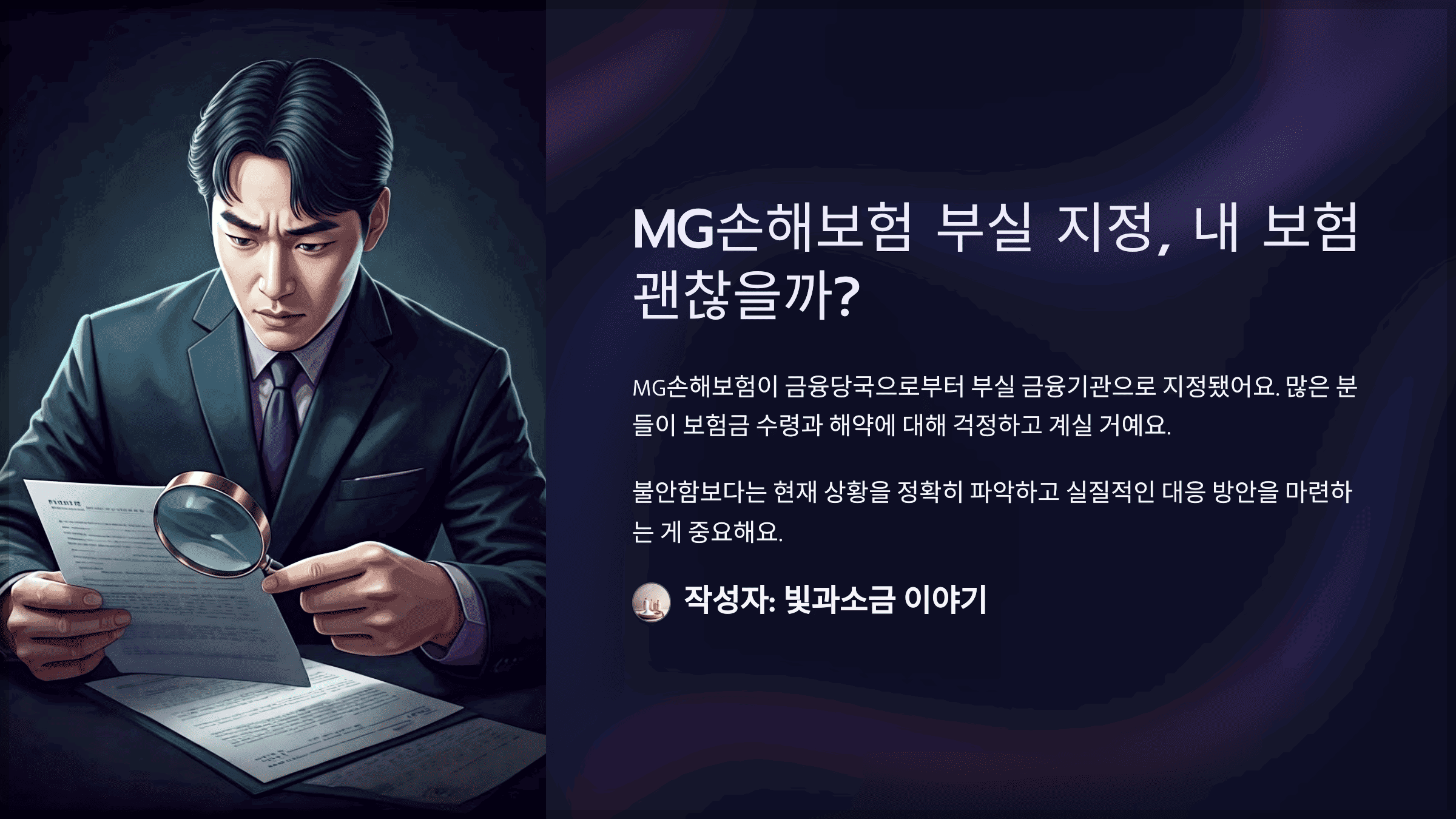 MG손해보험 부실 지정, 내 보험 괜찮을까? MG손해보험이 금융당국으로부터 부실 금융기관으로 지정됐다는 소식, 이미 한 번쯤 접했을 거예요. 뉴스나 커뮤니티를 보다 보면, “보험금 못 받는 거 아냐?”, “지금 해약하는 게 나을까?” 같은 걱정도 자연스럽게 생길 수 있죠.