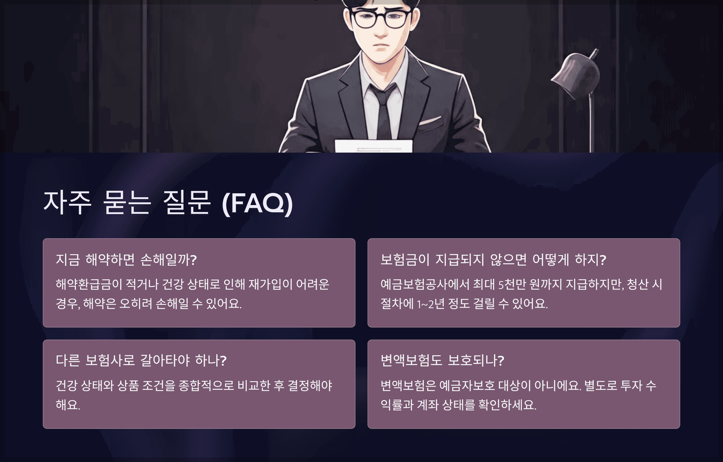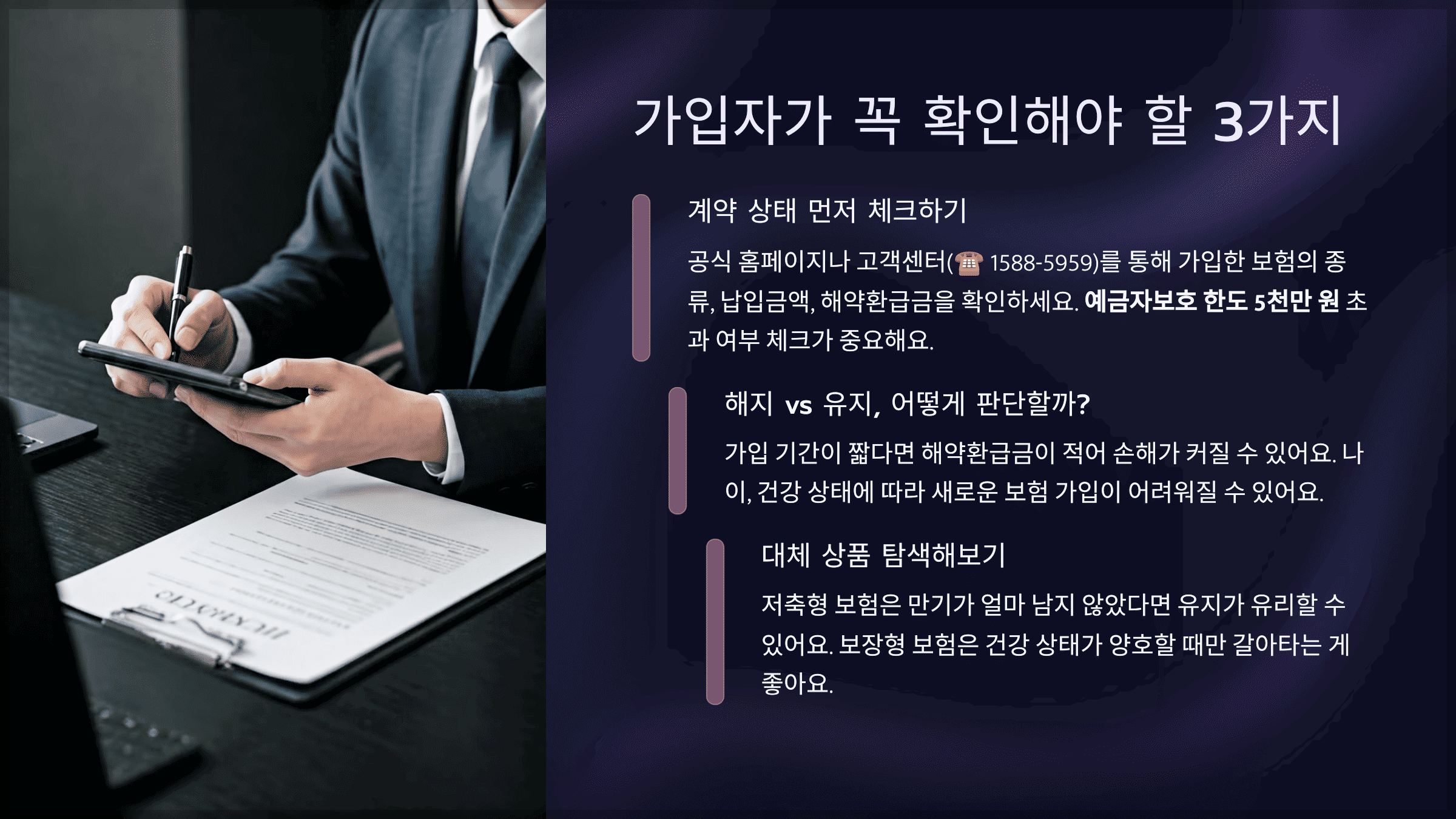 - 환급금 손실, 재가입 가능성, 보장 내용 등을 비교해서 판단.