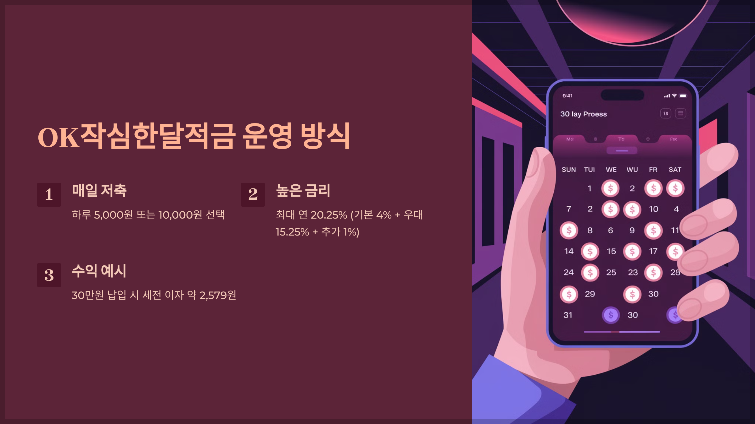 💡 지금 바로 OK작심한달적금을 시작하고, 효율적인 저축 습관도 만들고 높은 이자율도 받자!