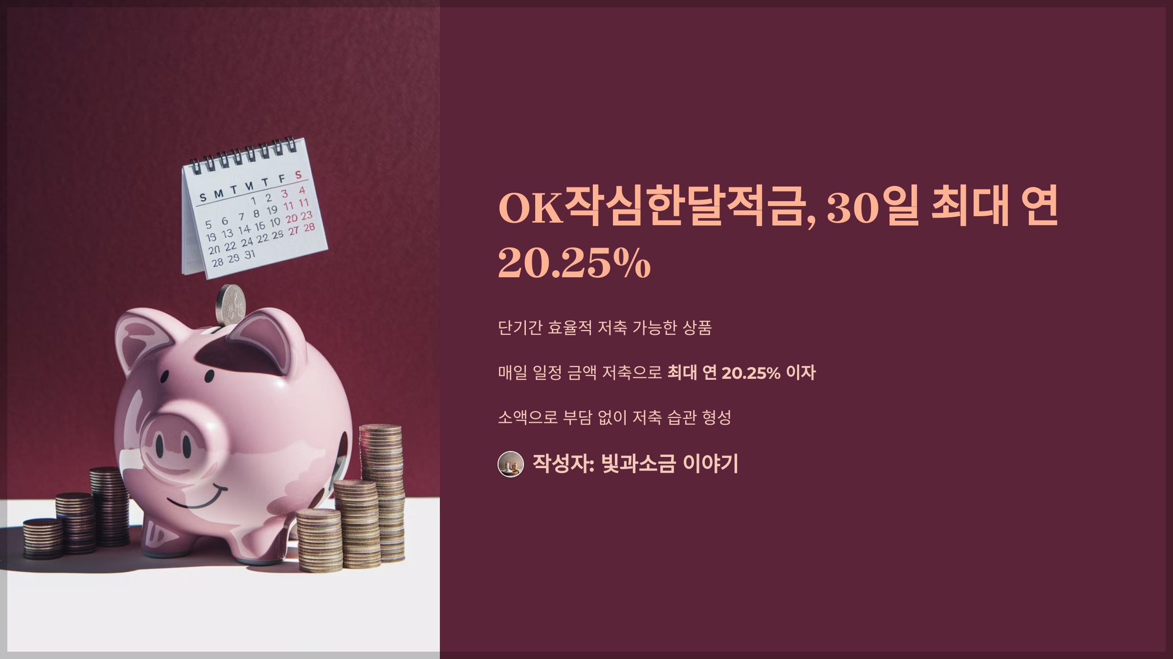 OK작심한달적금은 단 30일 동안 최대 연 20.25%의 금리를 받을 수 있는 단기 고금리 저축 상품이다.