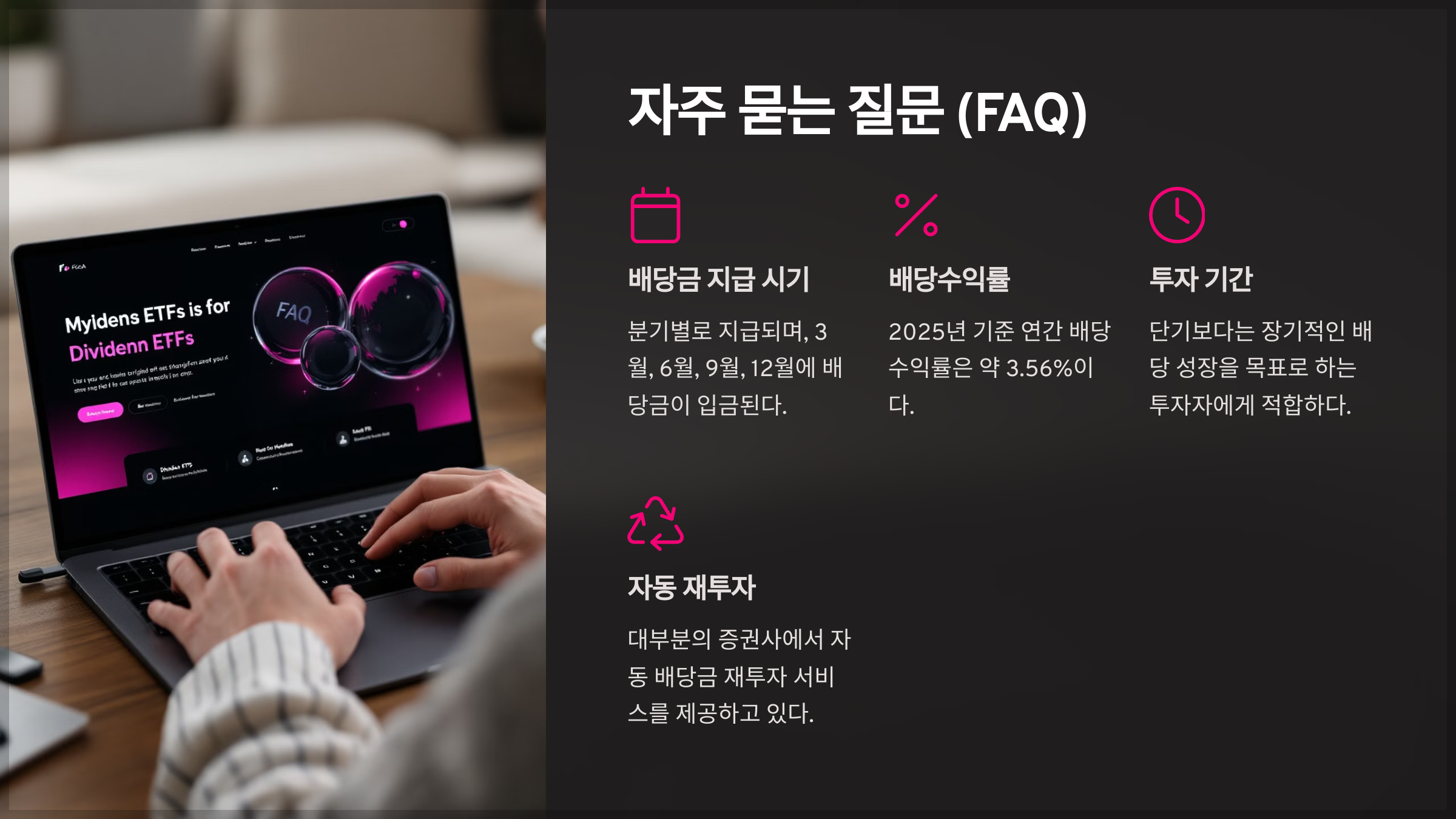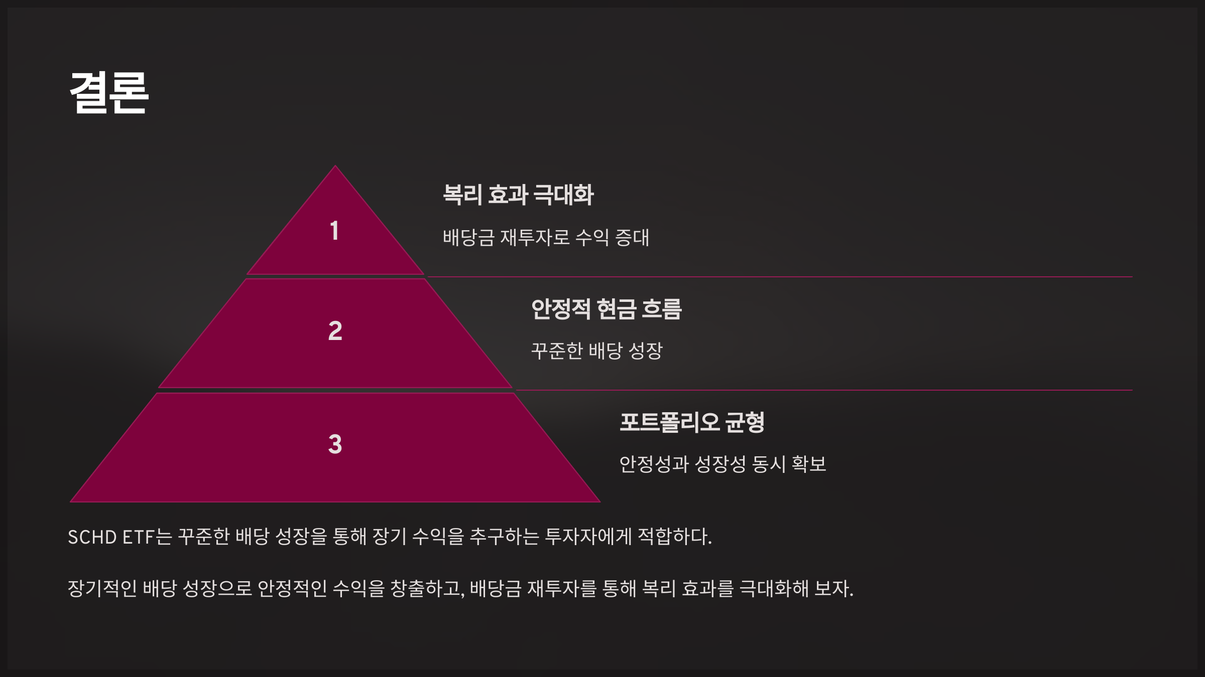 SCHD ETF는 단기적인 시세 차익보다는 꾸준한 배당 성장을 통해 장기 수익을 추구하는 투자자에게 적합하다. 배당금 재투자와 장기 보유 전략을 통해 안정적인 현금 흐름과 자본 이익을 동시에 기대할 수 있다. 특히 기술주 중심의 포트폴리오에 SCHD를 추가하면 안정성과 성장성을 동시에 확보할 수 있다.